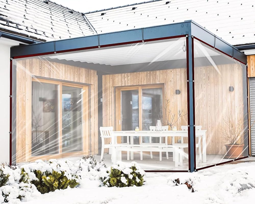 Heavy Duty Waterproof Tarp:Our clear tarp is made from high-quality vinyl plastic.In winter, this transparent tarpaulin can be used as a temporary isolation cover,not only shields your belongings but allows sunlight to filter through and keeps warm and prevent the accumulation of rain,snow and ice.The strategically placed grommets make installation a breeze, letting you secure the Heavy Duty Waterproof Tarp tightly and effectively.