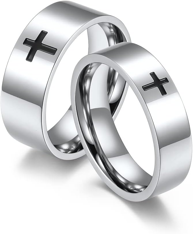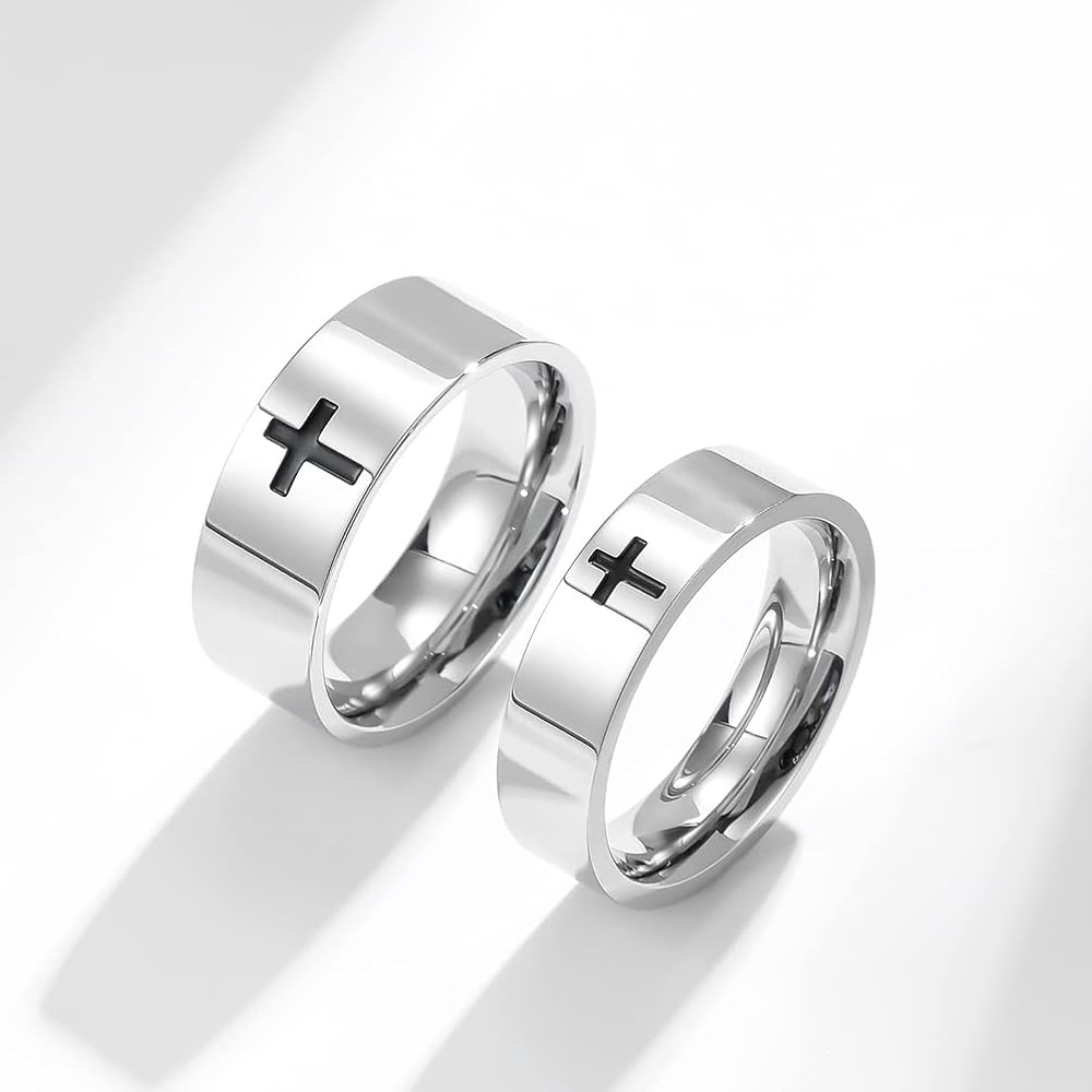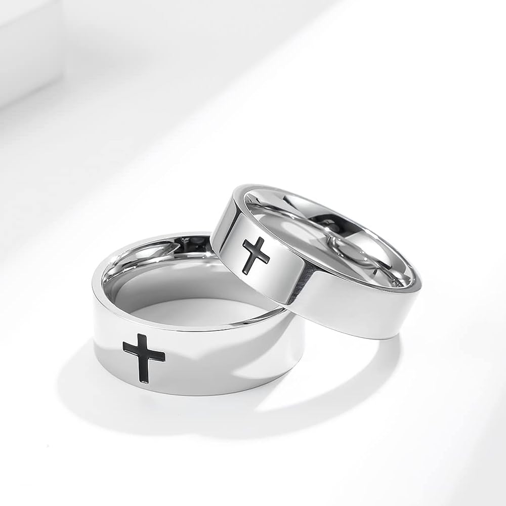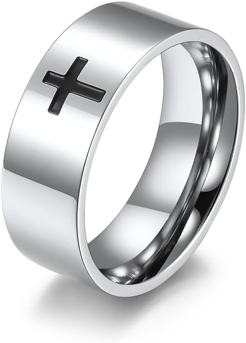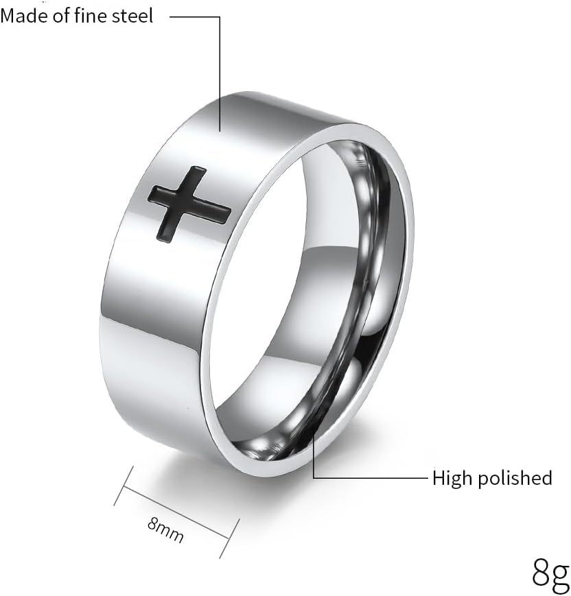 Make a meaningful statement with this elegant cross-design ring, available in both silver and black finishes. Crafted from premium stainless steel, this versatile band features a striking cross emblem and comes in two width options - 6mm or 8mm - to suit your style preference. The high-polished surface gives it a sophisticated gleam while maintaining durability for everyday wear. Perfect as a wedding band, promise ring, or faith-inspired accessory, it's designed to fit sizes 8 through 12. The sleek, contemporary design makes it suitable for any occasion, from casual to formal wear. The robust stainless steel construction ensures long-lasting quality and resistance to tarnishing, while the comfortable fit makes it ideal for continuous wear. Each ring weighs between 6-8 grams depending on the selected width, offering a substantial yet comfortable feel on your finger.