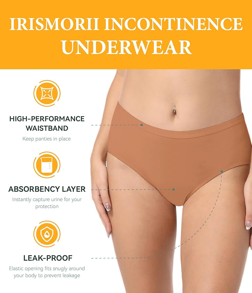 Maximum Protection for You: IRISMORII women's incontinence underwear features a five-layer crotch that is moisture-wicking, highly absorbent, leak-proof and odor-control, providing safe protection and comfort for a whole day