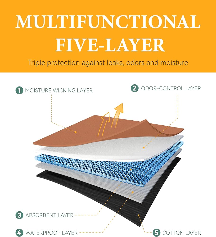 Preventing Leaks & Reducing Odor: The leak-proof layer and reinforced sides keep you secure during leak-prone moments, like sleeping or outdoor activities. The built-in odor control layer helps neutralize smells, keeping you fresh