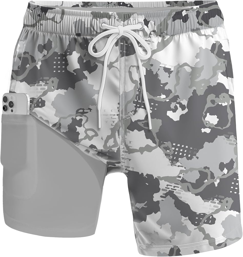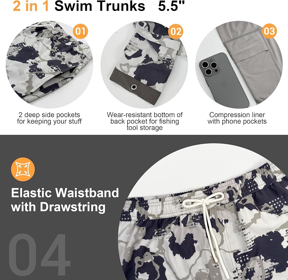 2 in 1 Swim Trunks: 5.5" mens swim trunks with a built-in compression liner to prevent chafing and irritation from sand. The four-way stretch, quick-dry, and lightweight fabric provides superior comfort.