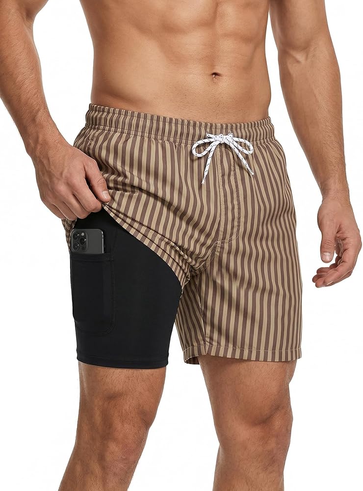 Mens Board Shorts With Mesh Compression Design: All of our swim trunks are made with our comfort technology quick dry fabric with compression lining. Elasticized waistband with drawstring can stretch and fixed the waist for comfort and adjustable. Mens swim trunks with pockets: the board shorts all get two beside pockets. It is mens elastic waist swim trunks and also mens drawstring swim trunks.