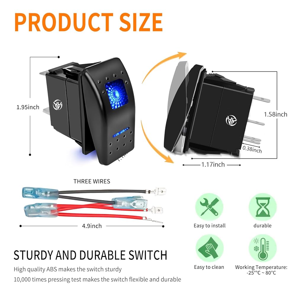 【WIDE APPLICATION--SUITABLE FOR CARS,TRUCKS,SHIPS,MOTORCYCLES,YACHTS】standard 5 pin switch,rated at 20amp/12vdc and 10amp/24vdc, available for upgrading most wiring.rocker switch panel fits for most car, suv, atv, utv, 4x4,motorcycle,truck,jeep,wrangler,boat,yacht and other off-road vehicles.harness to control led light bar,led work lights,fog lamps,taillights and auxiliary lamps,etc