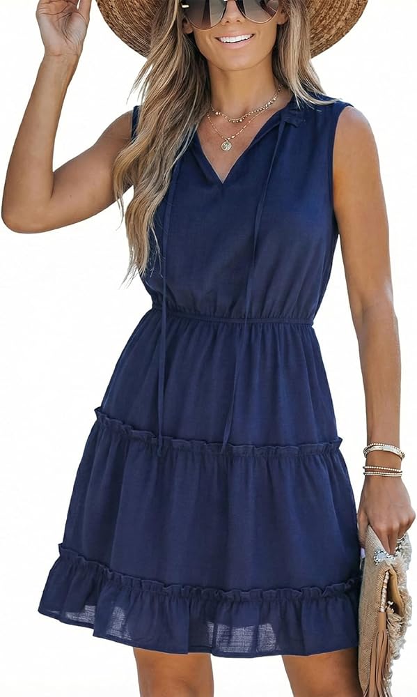 Tiered Mini Dress: Split neck short dress, Ruffle hem mini dress, Sleeveless v neck summer dress, with flattering self-tie tassels and tiered ruffle hem, which is perfect for everyday wear or street-ready outfit