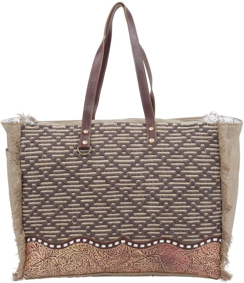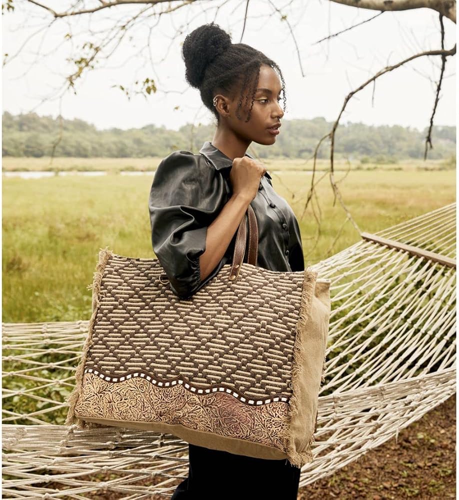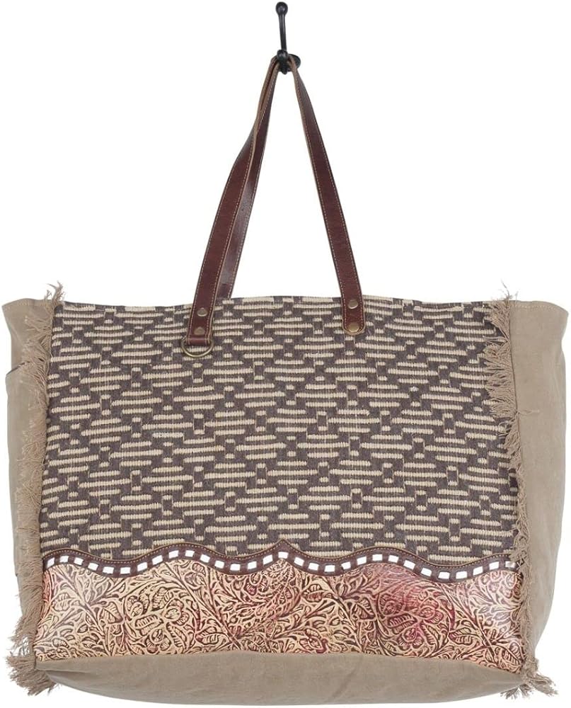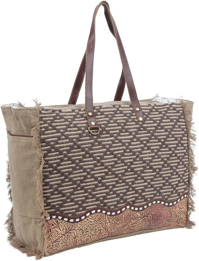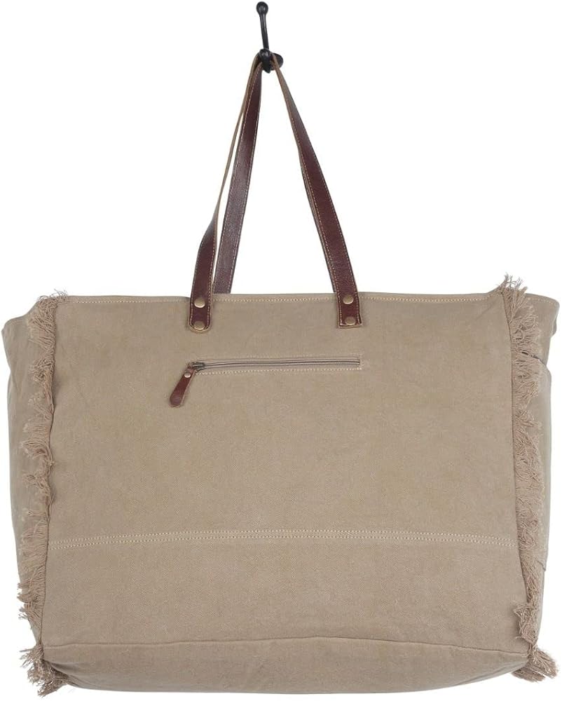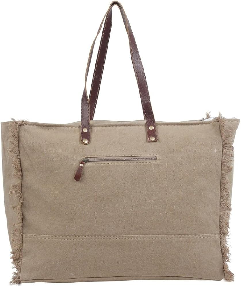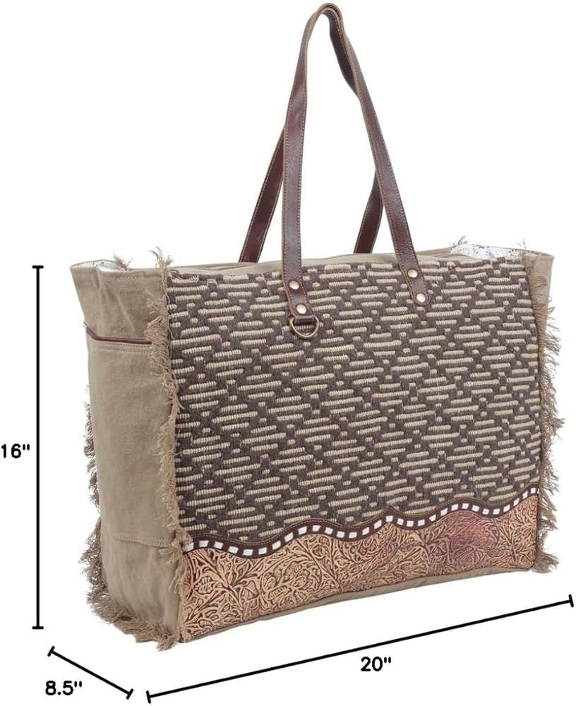 Constructed with a durable brown canvas material, this cowgirl purse is not just about style but also about durability. Whether you're looking for a large, aesthetic purse for daily use or for special occasions, this can cater to all your needs. The hair-on-hide purse's dimensions are 20" W x 16" H x 8.5" D with 12" top handles, making it spacious enough to carry all your essentials. It also features a zippered back pocket for items like keys, a cell phone, or a small wallet. With a zippered closure and a leather flap that snaps shut, you can be assured that your belongings will stay safe. The large side purse's frayed edges add a boho touch to its western style. You can use this purse with strap as a handbag or shoulder carry, making it a versatile accessory for any outfit.