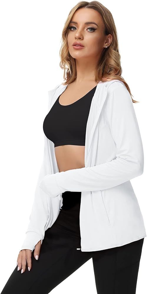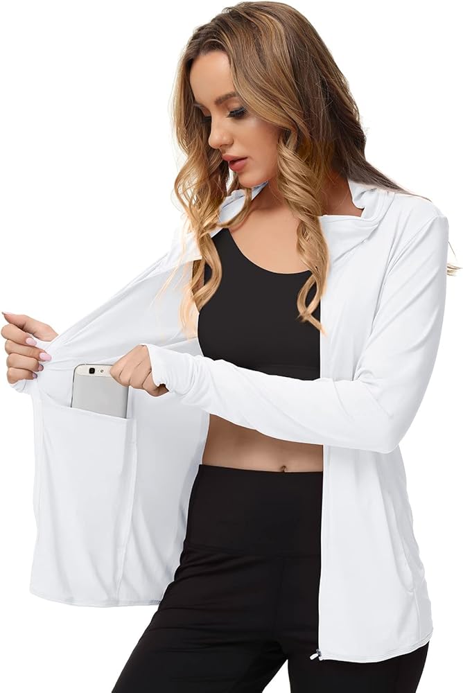 【Full Zipper Hooded &Thumb Holes Design】Our sun protective full zipper hooded Jacket for women features hooded design preventing your neck/face form sunburn in the sun. Long Sleeve with thumbholes design shows more fashion sense,keeps the sleeves in places & trap warmth and give extra coverage for sun protection With Long Sleeve.
