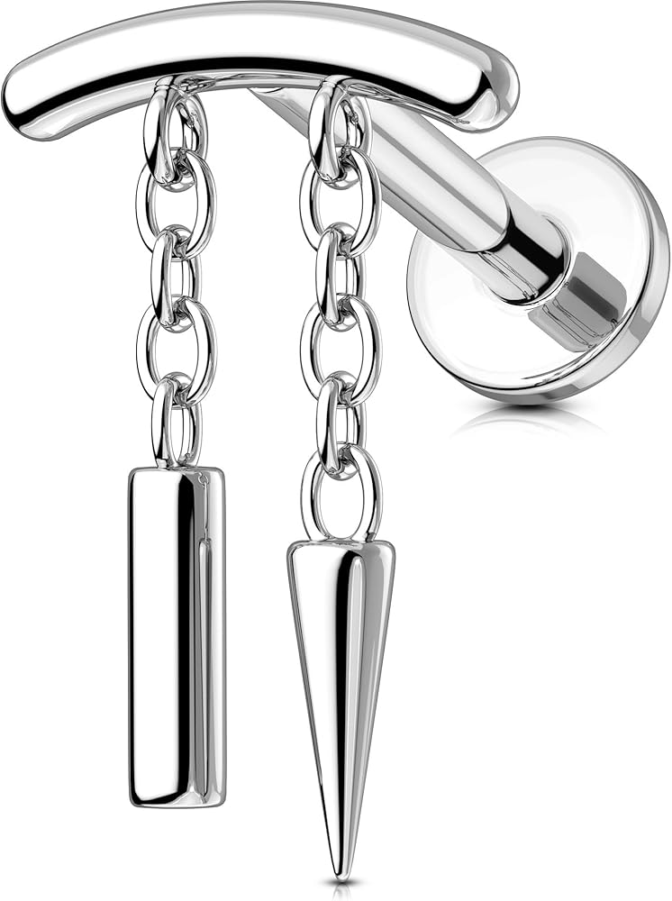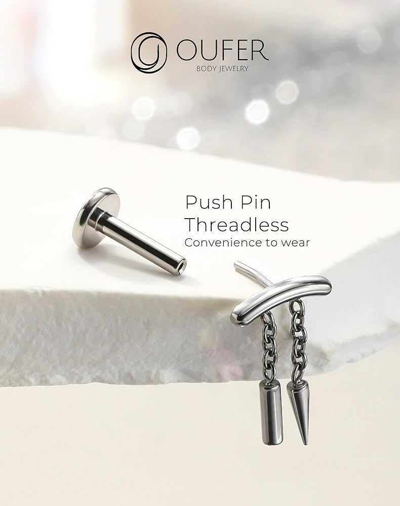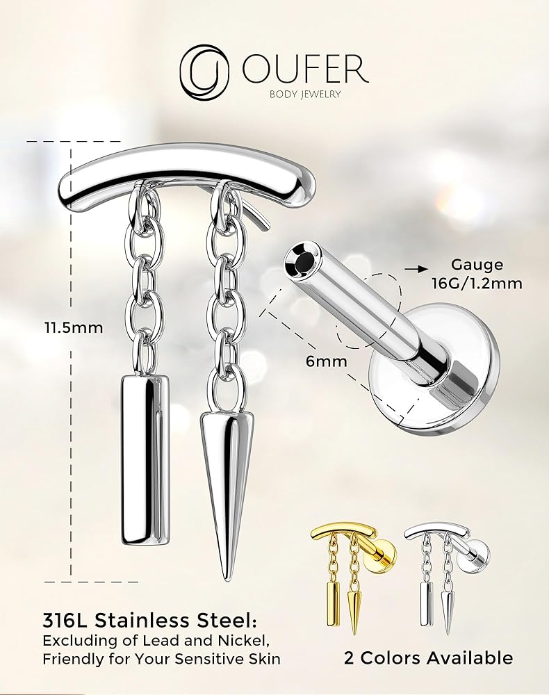 【Silver Dangle Studs】: This threadless cartilage helix piercing with chain boasts an exquisite design, paired with dazzling chain, offering a blend of simplicity and elegance.