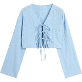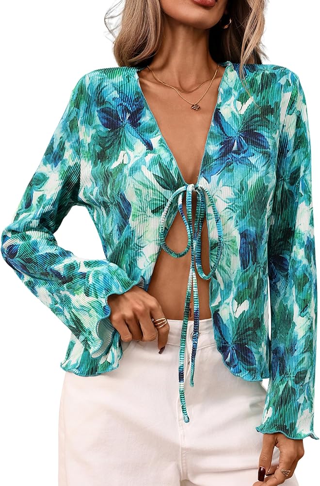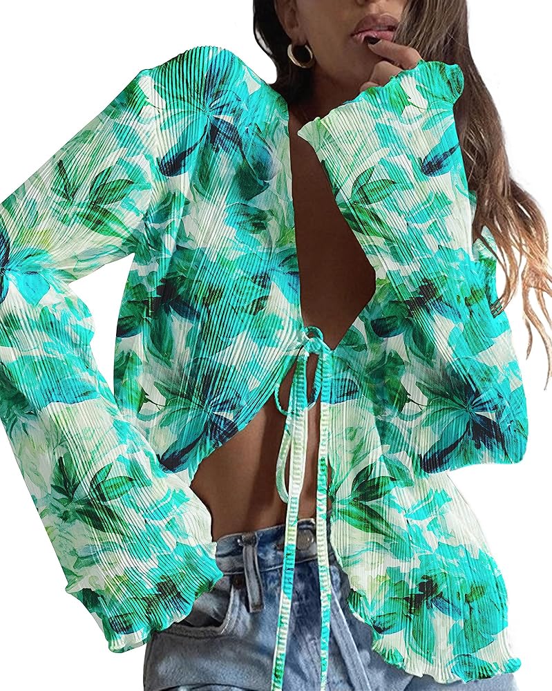 Features: Tie Front, long sleeve, V-neck, bell sleeve, plisse pleated, solid color, ruched design