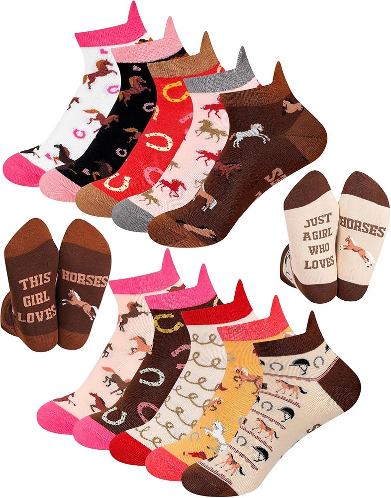 You'll receive 10 pairs of horse ankle socks. With cute horse patterns, they add a fun touch to any outfit. Worn at home, during travel, or horseback riding. The socks have unique designs for various occasions. Made of cotton polyester blend, they are breathable, comfy, and anti pilling. Suitable for US shoe sizes 5-10. A great gift for horse lovers. Comfy and fit most women.