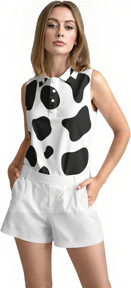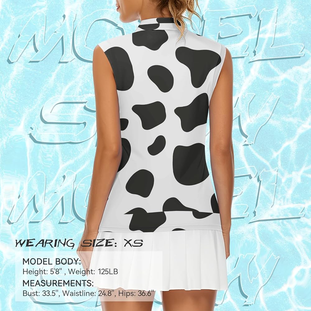✫【Golf Polo Intimate Design】This Black And White Cow Print golf shirts for women is stylishly designed. the polo shirt adopts a sleeveless design and a close-fitting cut to shape the body and create a fashionable look that is suitable for most people's body shapes.