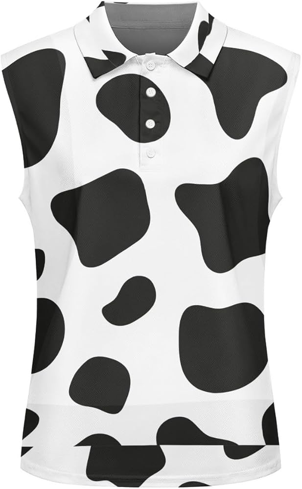 Womens Black And White Cow Print Sleeveless Golf Shirt Athletic Tank Tops Ladies Casual Summer Milk Pattern Golf Wear Polo Tennis Shirts for Women Large