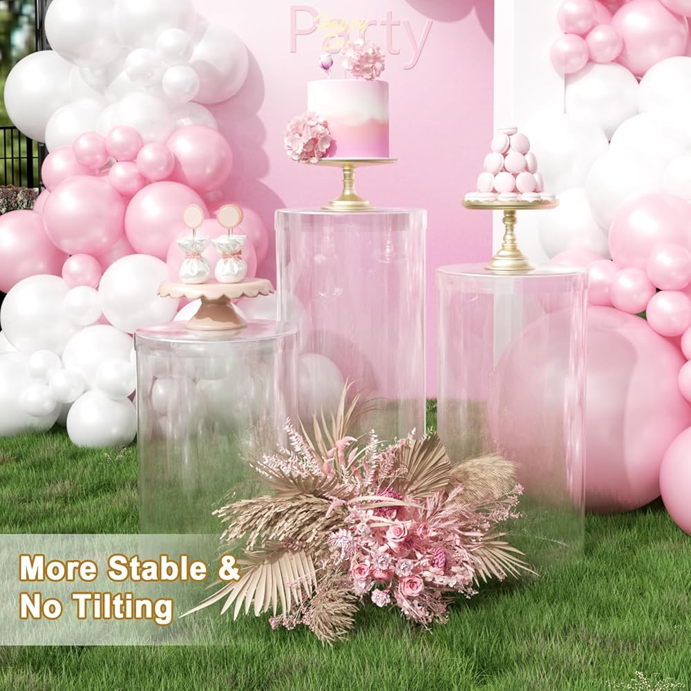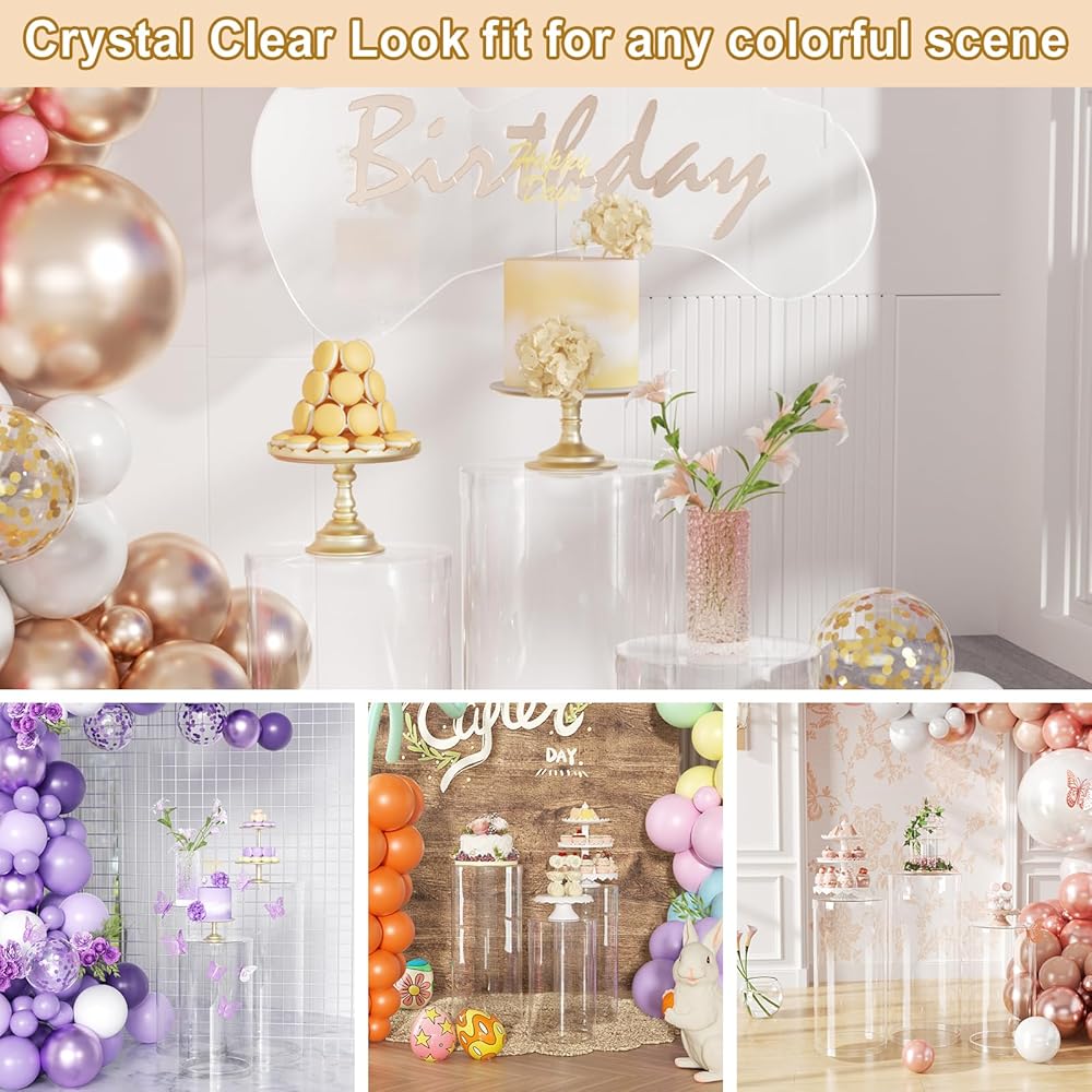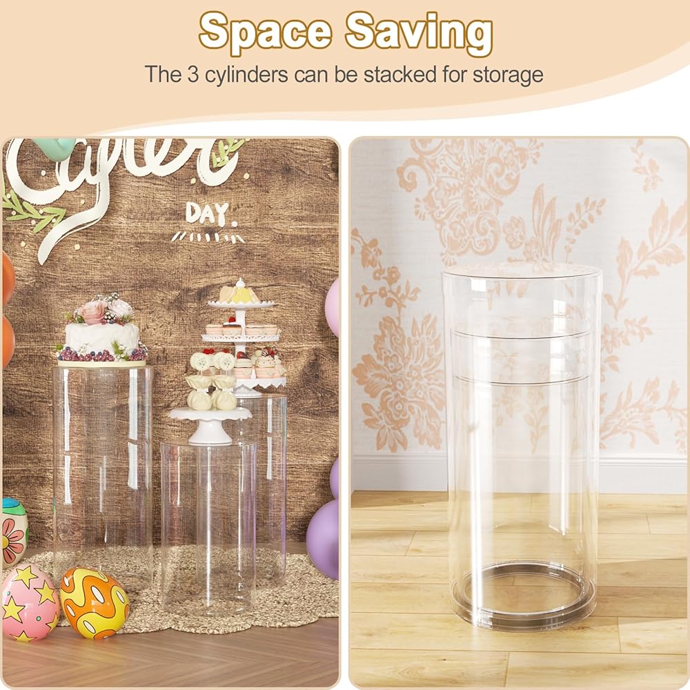 3Pcs Round Cylinder Pedestal Stand:Large cylinder stands for party includes three Clear column stands, 3pcs large pedestal stands for parties measures 15.7*35.4''(L),14.2*29.5''(M),13*23.6''(S), larger size of this cylinder stands will better display your decors. Three different sizes of cylinder pedestal display plinth pillars to give you full choice.