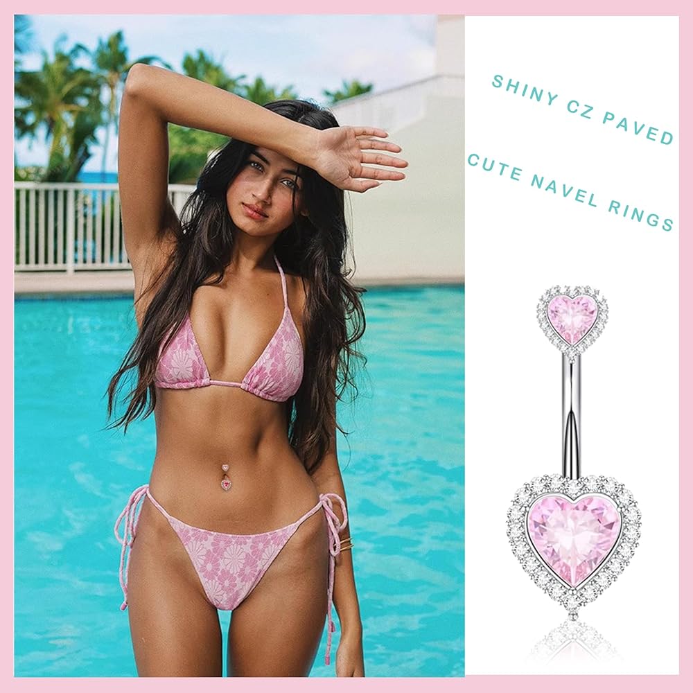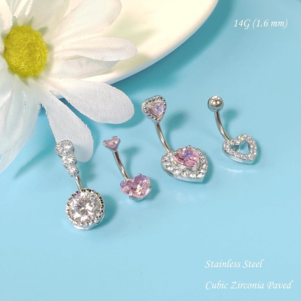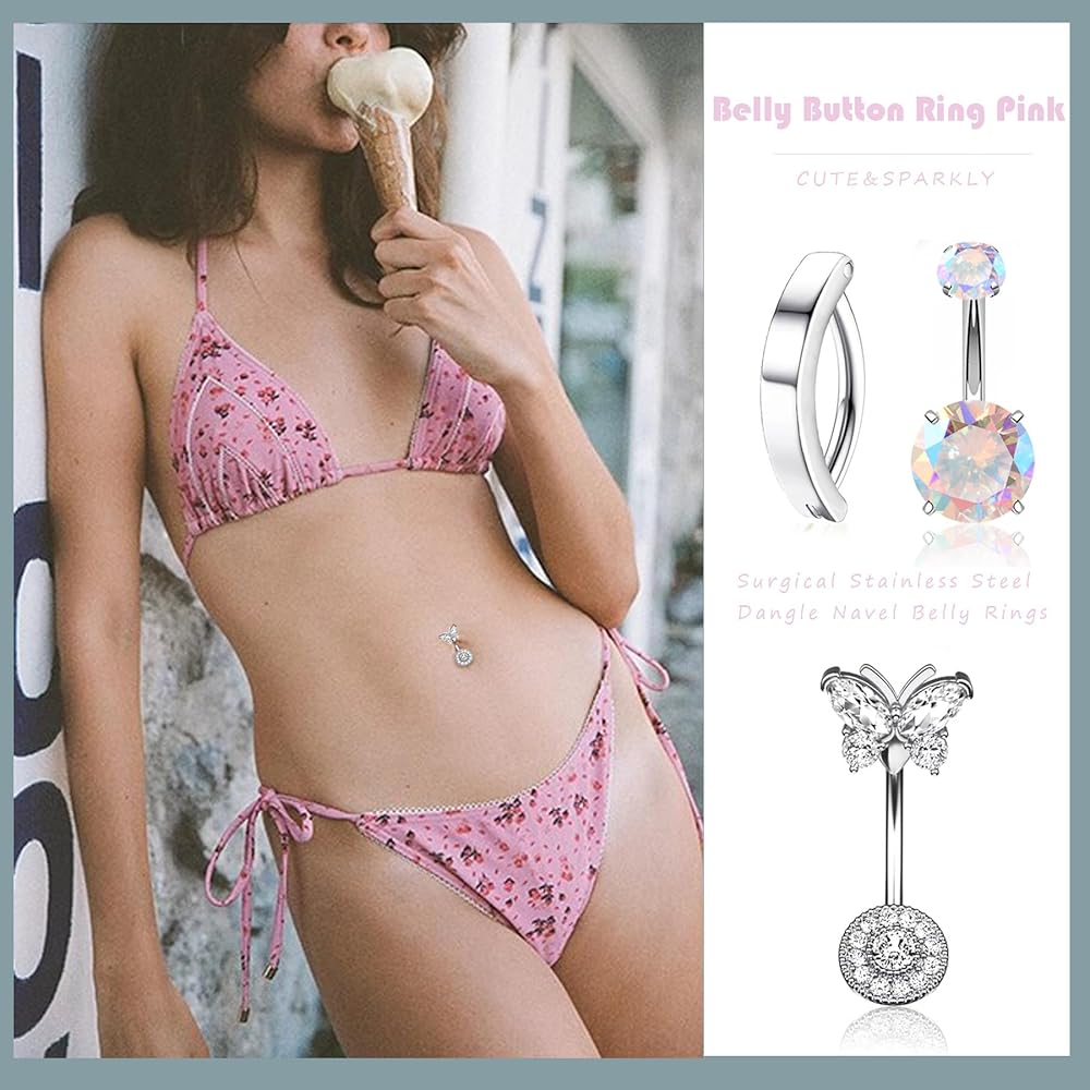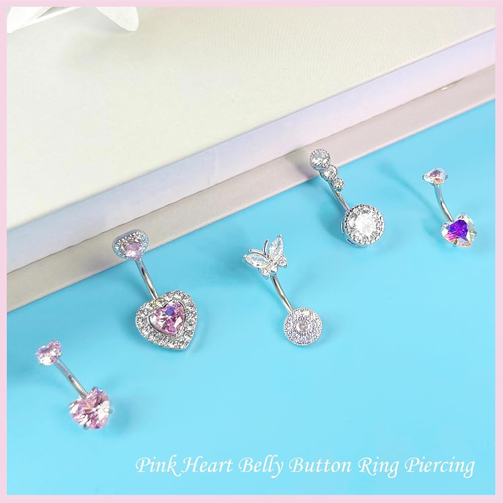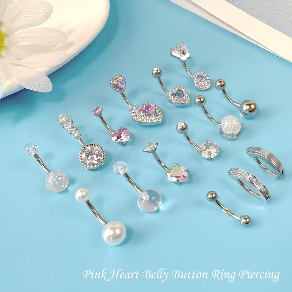 [ BELLY BUTTON RING SET ] 1 belly button ring pack includes 15 pieces cute belly button rings, including internally threaded pink heart belly rings, cubic zirconia butterfly belly button ring, simple clicker navel piercing, pearl navel ring and so on. Belly button piercing with nice clear looking stones and beautiful designs, have different varieties for women to choose from and match for your outfit