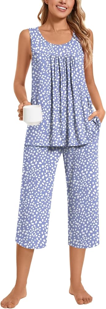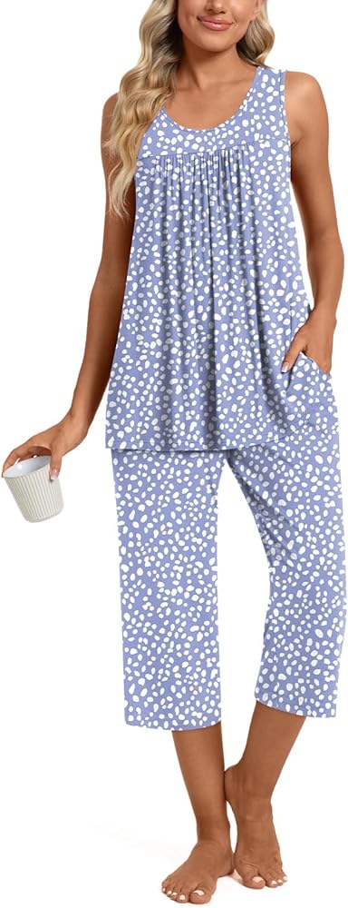 Fashion-Simple Design: Cute two piece outfits, sleeveless tops, capri pants, soft nightwear, scoop neck and front pleated detailed design. Elastic waistband pants, casual loose comfy, graceful and easeful