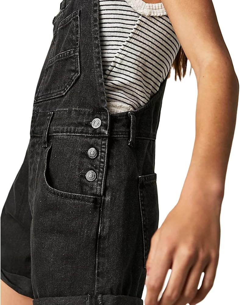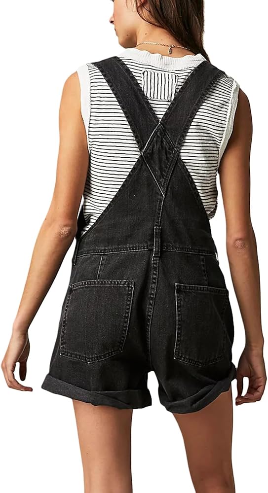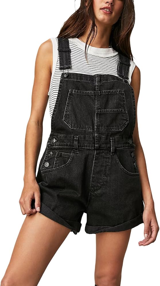 Women Denim Bib Overalls Adjustable Straps Pocket Romper Shorts Casual Rolled Cuff Shortalls