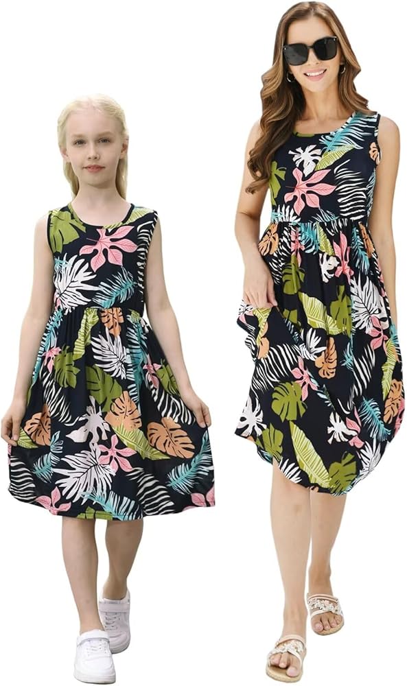 SHOOYING Mommy and Me Dress, Sleeveless Floral Printed Family Matching Hawaiian Beach Midi Dresses