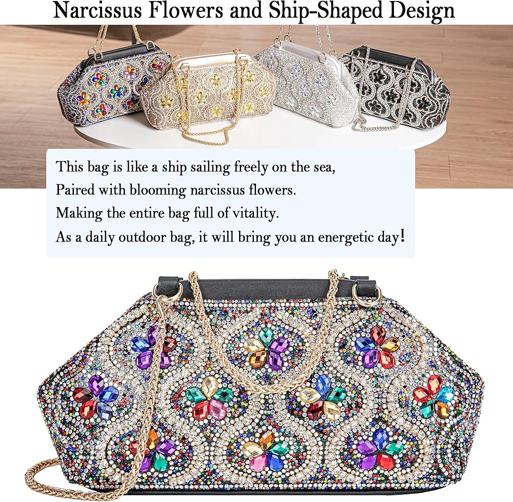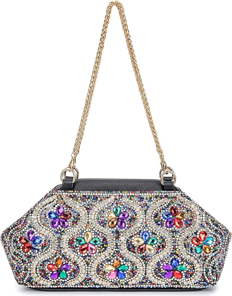 Our BBTT.ful glitter evening clutch is full of dazzling rhinestones,exquisite floral design.It can be used as a shoulder bag, crossbody bag, and handbag.This bling sparkly evening bags have the timeless appeal,which will match your clothing perfectly and make you charming at cocktail parties, proms, weddings, balls, club events, and evening outings. It also makes a thoughtful gift for special days like Valentine's Day, Mother's Day, birthdays, and Christmas.
