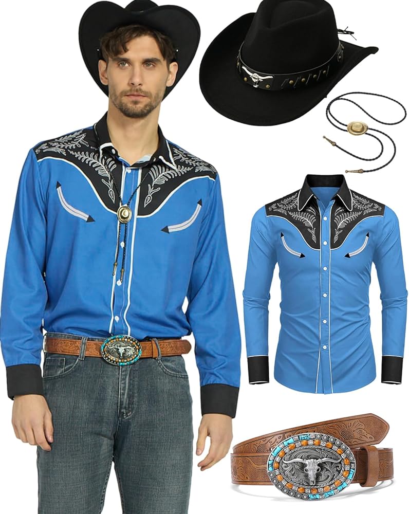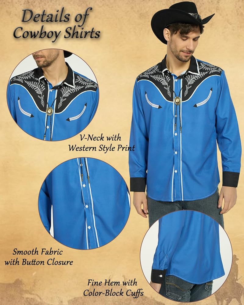 Complete Cowboy Costume Set for Men:This cowboy outfit includes everything you need for a full cowboy look: a Western-style printed long sleeve shirt, a cowboy hat, a bullhead buckle cowboy belt, and a necklace. Ideal for cowboy costume parties, Western events, or a fun day at a rodeo, this outfit has you covered for any occasion where you want to showcase your cowboy spirit