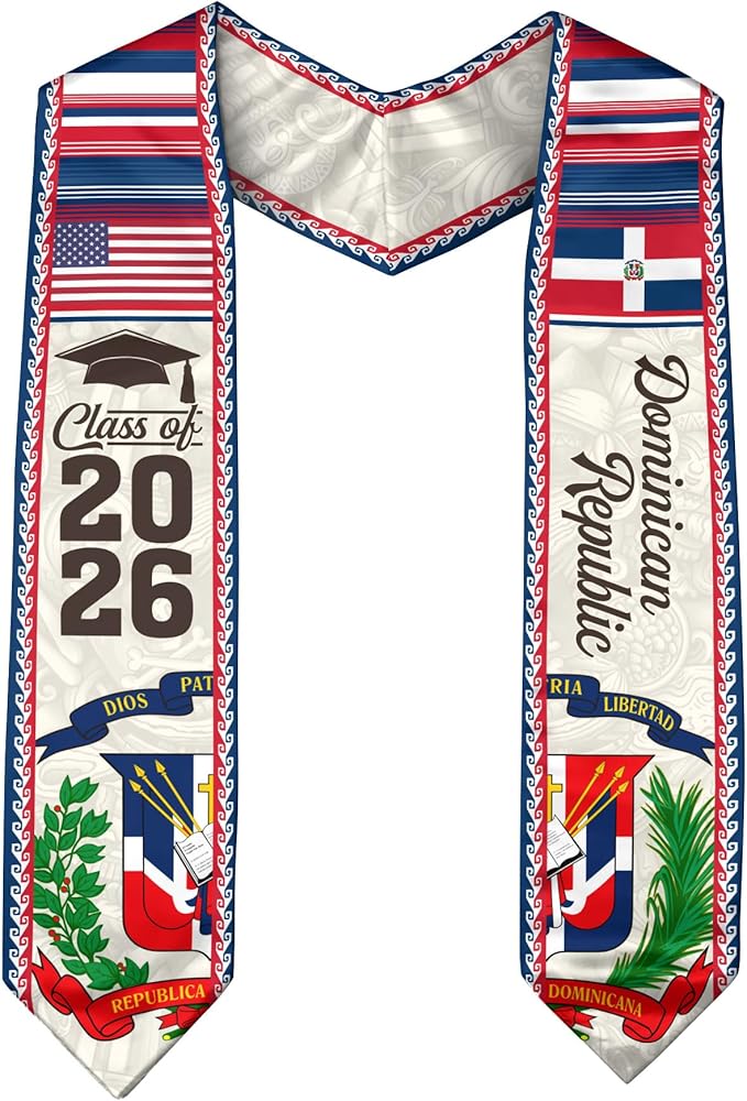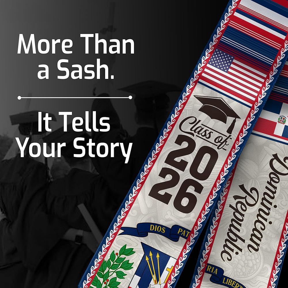 Our graduation sash class of 2024 is printed with Dominican and American flags, echoing the theme of the international graduation season, which celebrates graduation for you, making your graduation even more memorable & meaningful