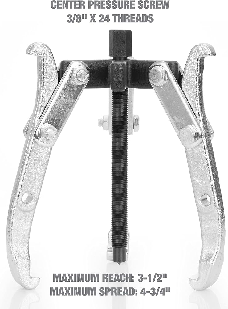 Expand Your Reach: The maximum reach of this gear puller set is 3 1/2 inches; The maximum spread is 4 3/4 inches; The 3/8 inch center forcing bolt measures 24 by 4 7/8 inches