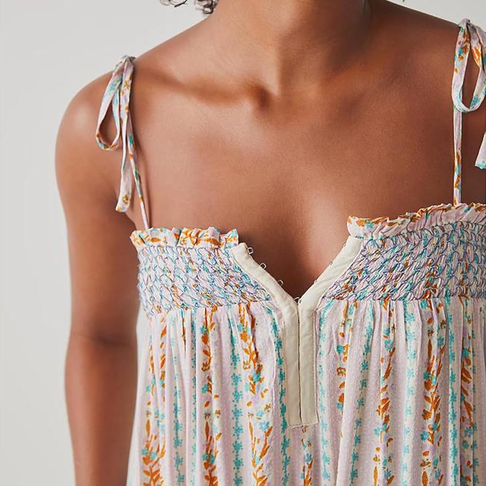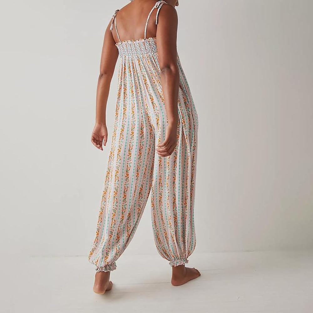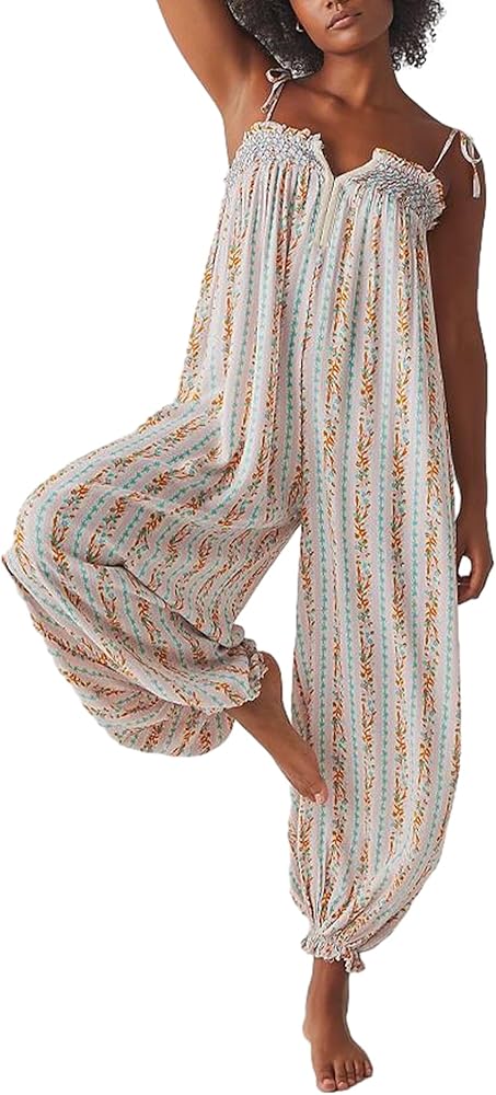 Women Summer Cami Jumpsuits Retro Floral Print Tie-Up Spaghetti Strap Sleeveless Long Rompers Fashion Loose Playsuits