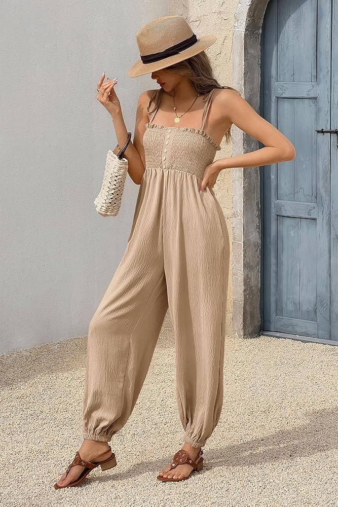 Lightweight Smocked Fabric: Crafted from soft, lightweight smocked fabric, our Womens Summer Smocked Jumpsuit provides ultimate comfort for warm days, making it an ideal choice for spring outfits for women in 2025