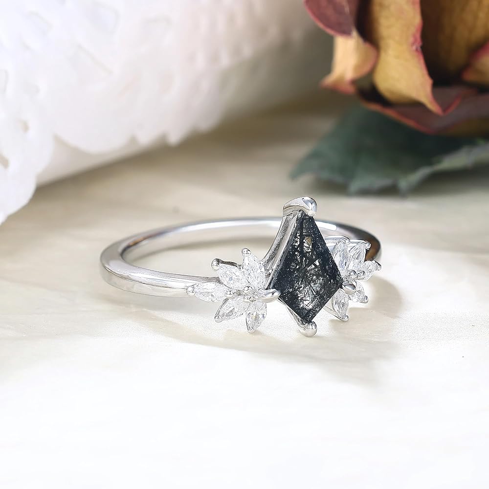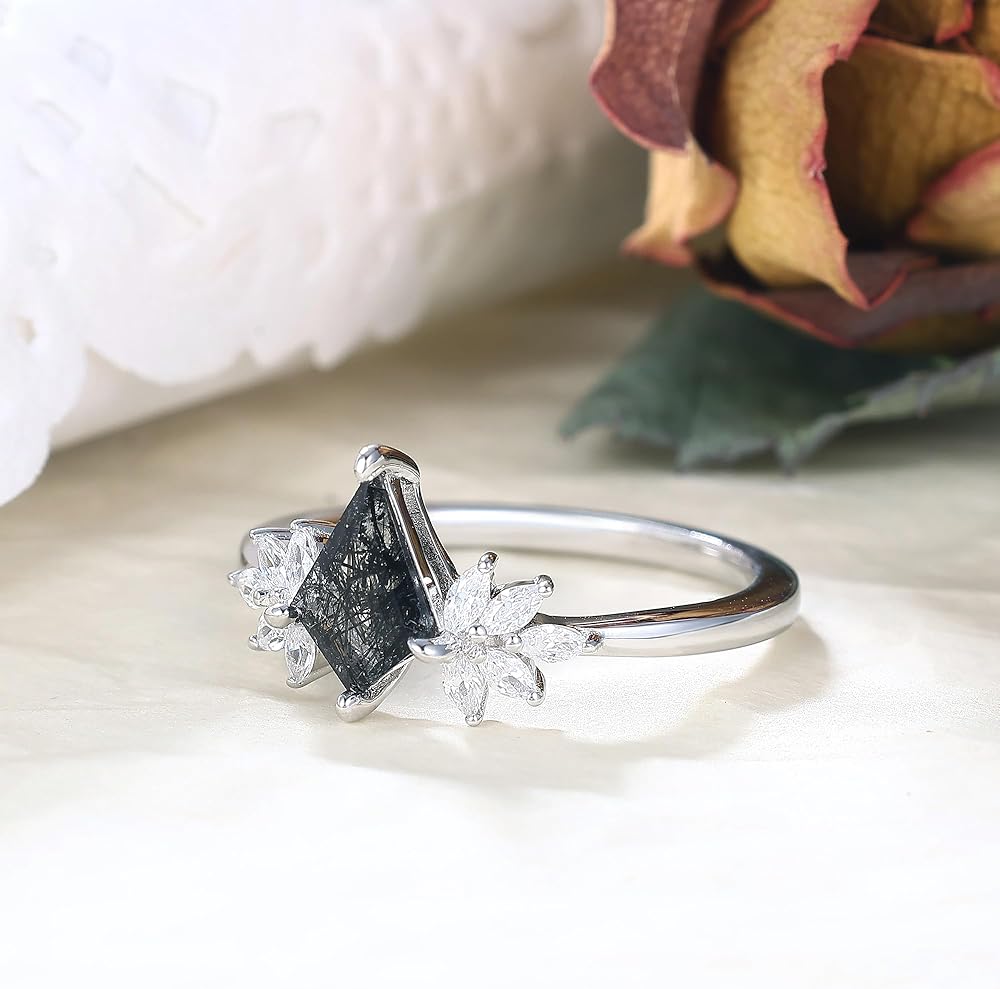 About Gems & Metal: Accents by Cluster 10PCS 0.45 Carat Excellent marquise cut white Zircon, This vintage ring is 4 prong center set with a 6x8mm Excellent emerald cut 2.0 Carat Natural Black Rutilated Quartz! The ring band are Crafted and Polished in genuine 925 sterling silver which plated by platinum to ensure long-lasting shiny luster. No worry about stones falling out or ring band tarnish! 100% Lead-free, Nickel-free, Allergy-free