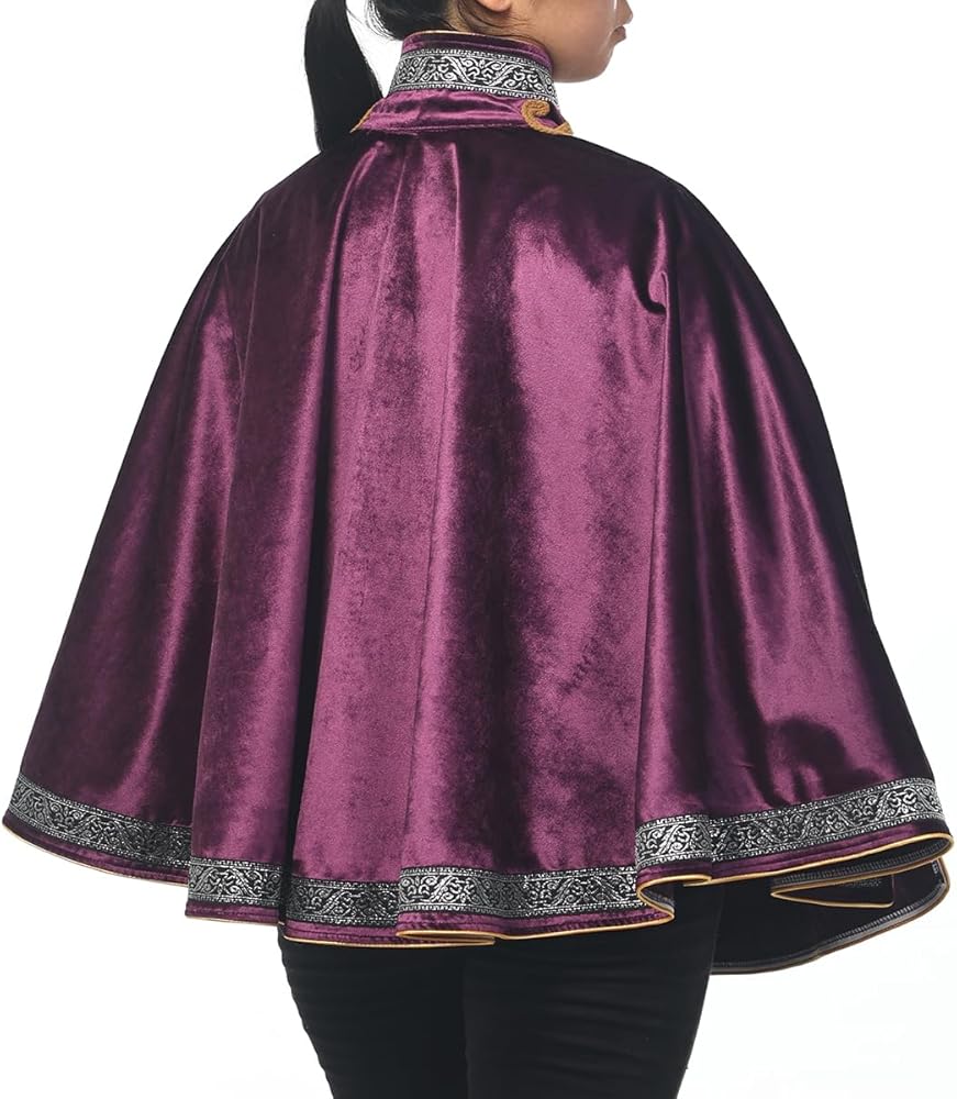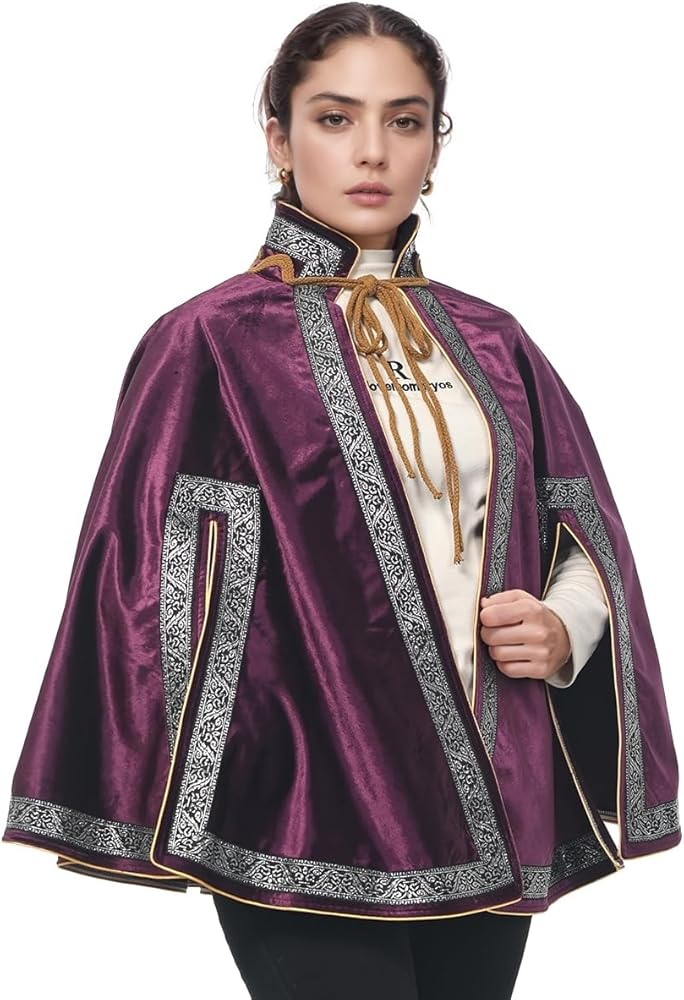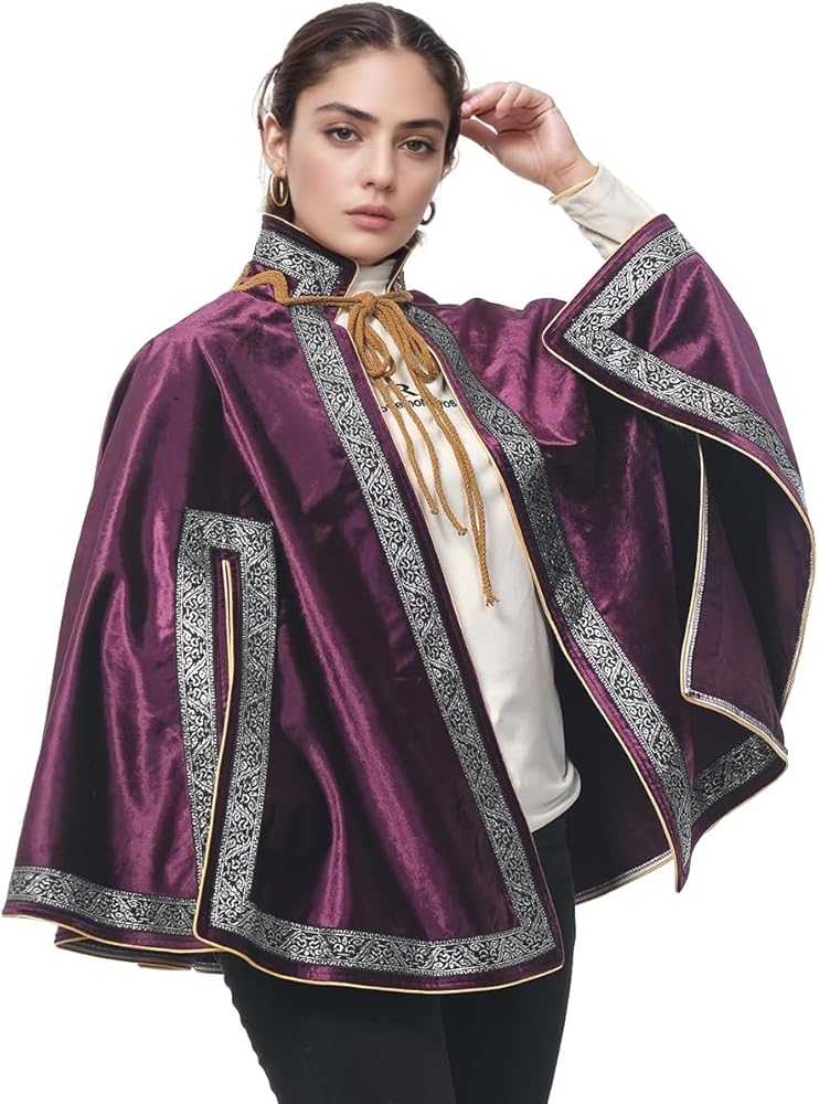 Design: The Cape is a hip-length capelet featuring a high collar and ornamental cord fastening. Its elegant appearance makes it an excellent accessory for a variety of Renaissance or fantasy costumes, particularly suitable for nobility or musketeers. The Cape boasts an elegant cut with three arm slits that allow for different wearing styles. It can be secured around the neck or across the chest by tying the lengthy cord.