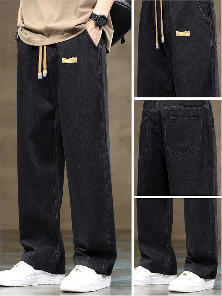 - Design: Letter patched, elastic waist, drawstring waist, straight leg jeans, casual denim trousers with pocket