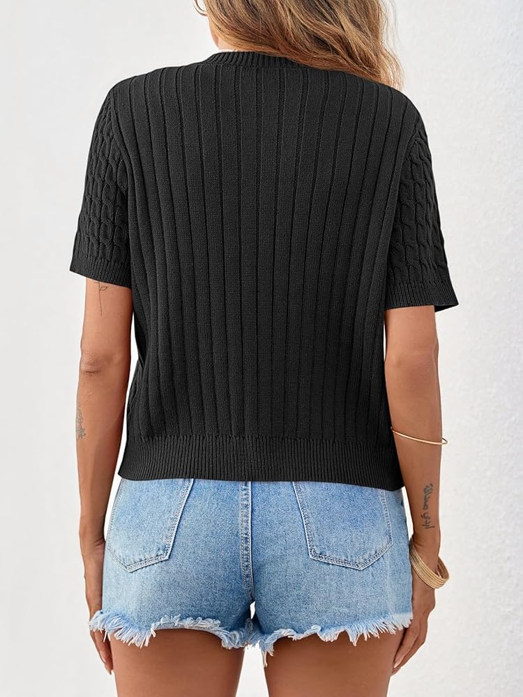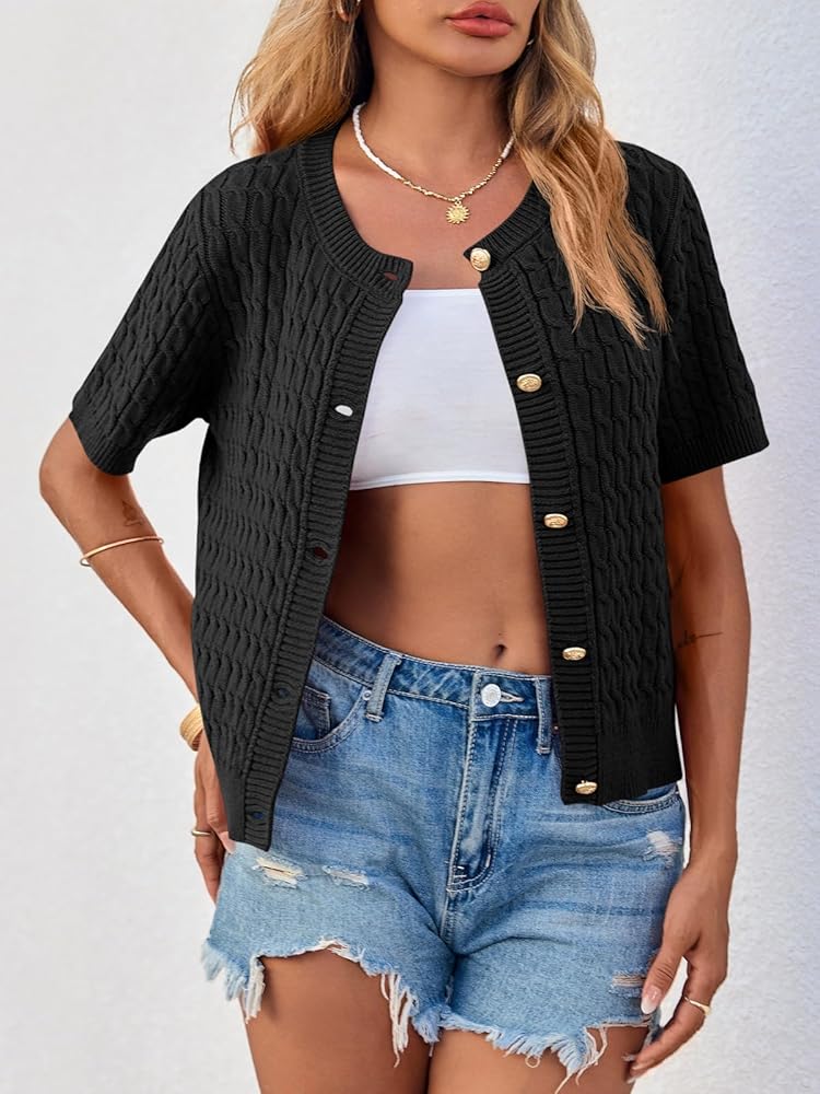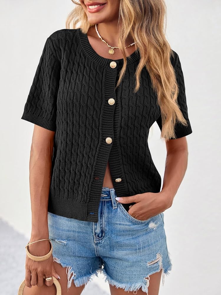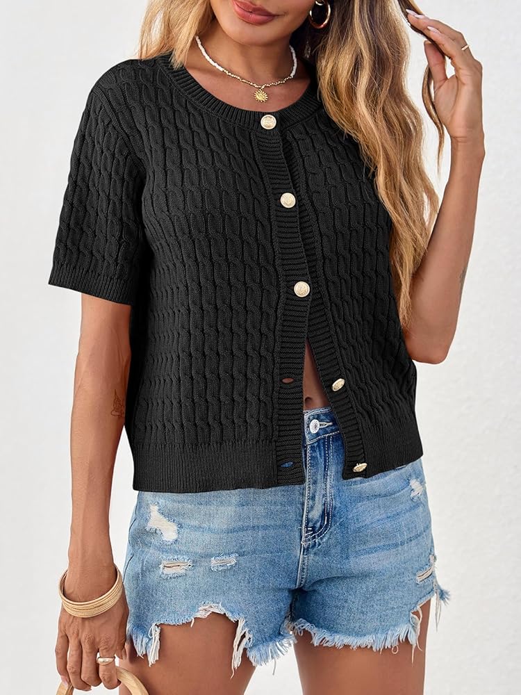 Feature: Classic crew neck, cable knit cardigan sweater, short sleeve sweater top, metal button up sweater, lightweight cardigan, slightly cropped length, solid color.