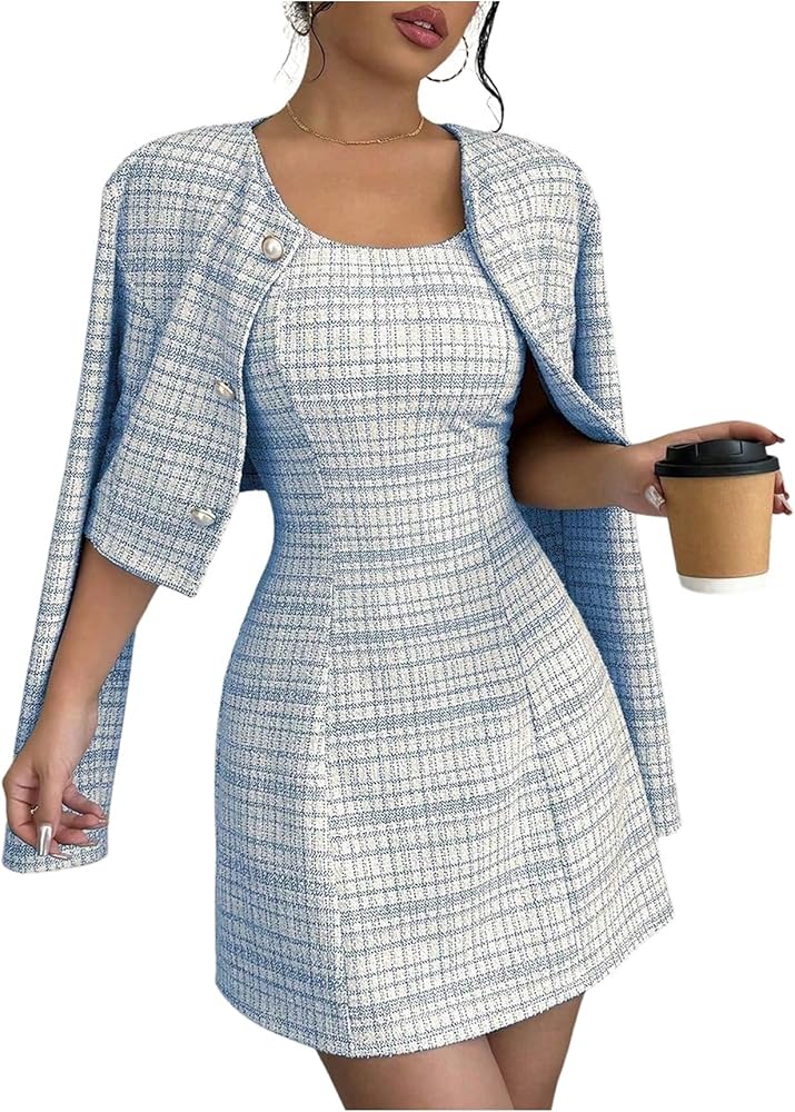 • Feature: Plaid, button front, long sleeve, cropped jacket and sleeveless mini tank dress, 2 piece set for women, fashionable