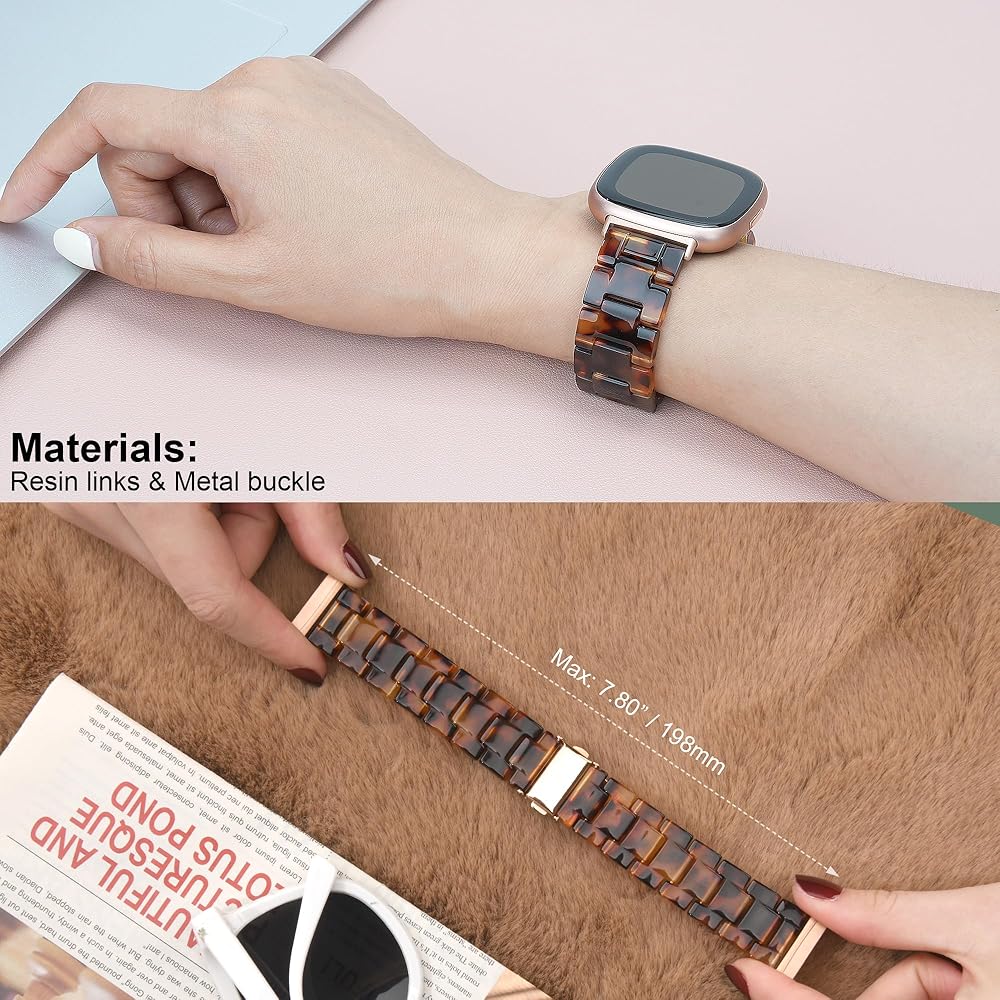 【Premium Resin Material】The Replacement Band for Fitbit Versa 4 Band for women are made of premium resin material and adopts stainless steel fold-over clasp with double push button safety closure design, make the dressy watch band looks stylish and safe. This Vesa 4 wristband for women men is Lightweight and comfortable to wear. And it is washable, easy to clean the tortoise watch band for Fitibt Versa 3/Versa 4