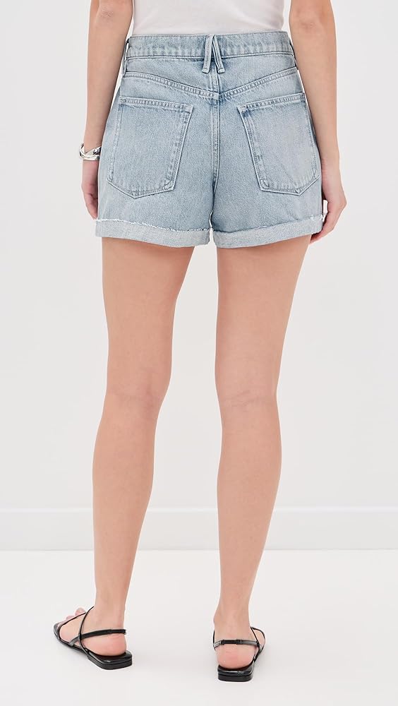 Experience the '90s with our retro-inspired denim shorts, blending vintage style with contemporary comfort for a chic, enduring look. Mid-rise, relaxed fit, classic denim feel, subtle distressing, raw hem, five pockets, reinforced belt loops, secure waistband, tummy-smoothing tech, light blue wash, 3.5" inseam.