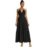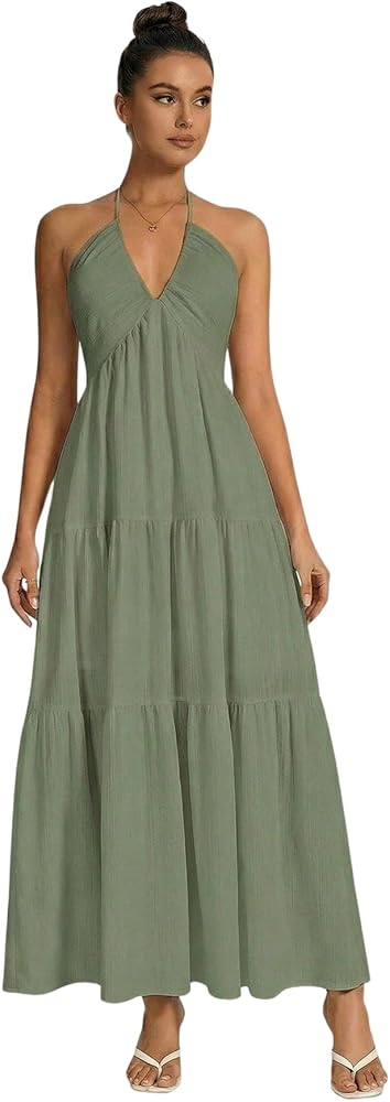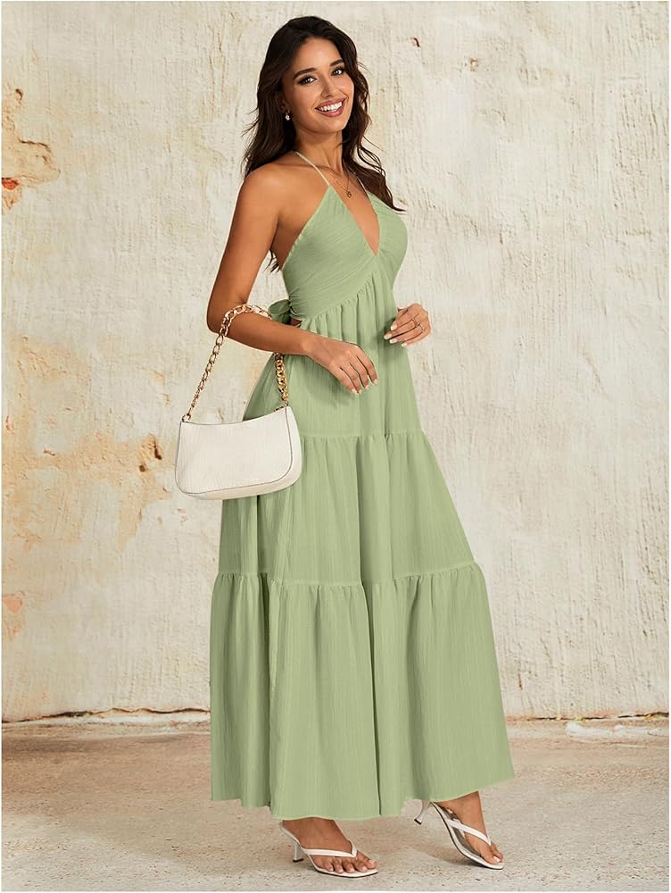 - Feature: Backless, v neck, sleeveless, tie back, bow knot, ruched, tiered, flowy, elegant, halter maxi dress