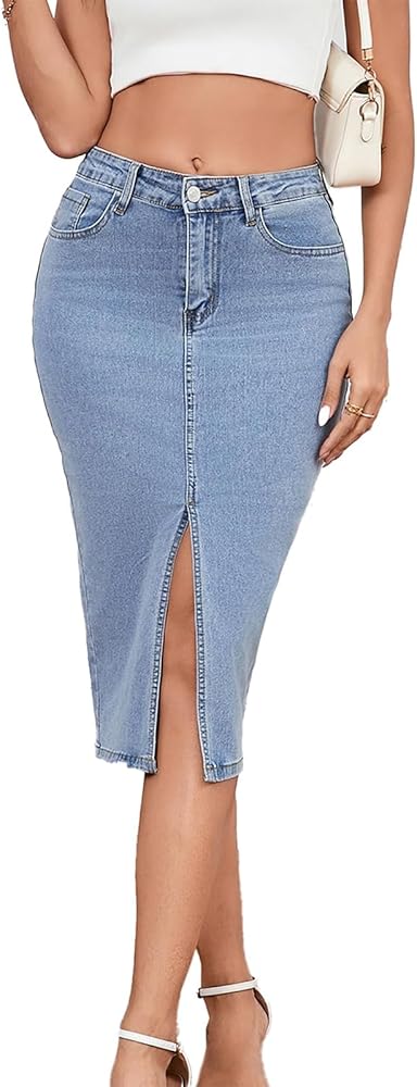 Women's Casual Jean Skirt High Waist Slit Midi Denim Skirt