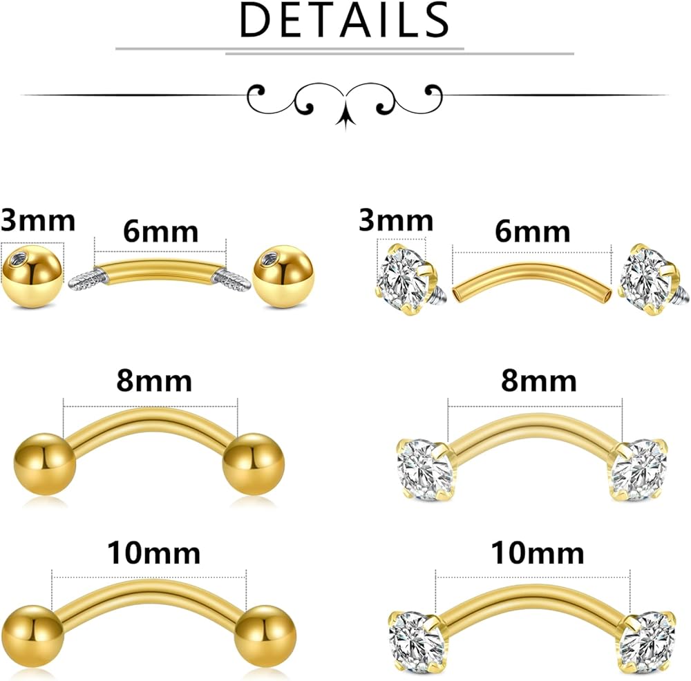 Piercing Pack Sizes:Gauge: 16G (1.2mm);Wearable Bar Length: 6mm(1/4"), 8mm(5/16"), 10mm(3/8'); Ball/CZ Size: 3mm;Suitable wearing sizes for different parts of the body.