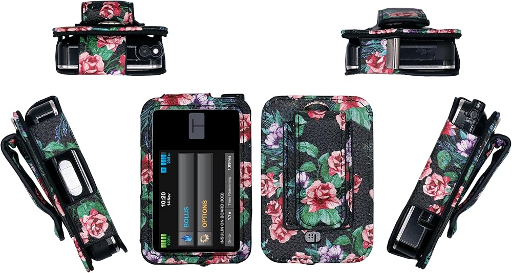 Premium Patterned Holster (with Belt Clip/Metal Loop/Lanyard) for Tandem Diabetes Care Insulin Pump T:Slim X2 (All Models) (Black-Rosa chinensis)