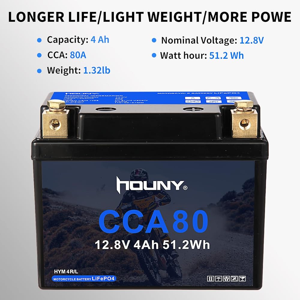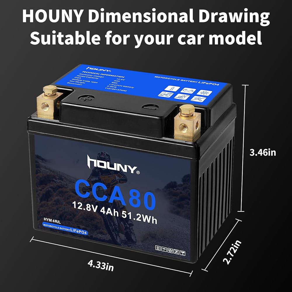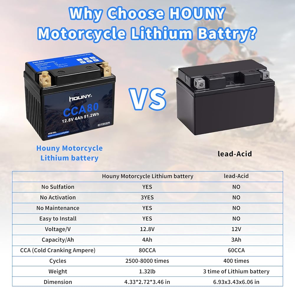 【Advanced LiFePO4 Technology for Superior Performance】Houny LiFePO4 batteries outperform traditional lead-acid batteries in every way. With no sulfation, activation, acid, or water needed, our 12.8V 20Ah motorcycle battery features 480 CCA cold cranking power and over 500 start cycles. Experience thousands of recharge cycles, long-lasting durability, and superior reliability with the advanced LiFePO4 technology.