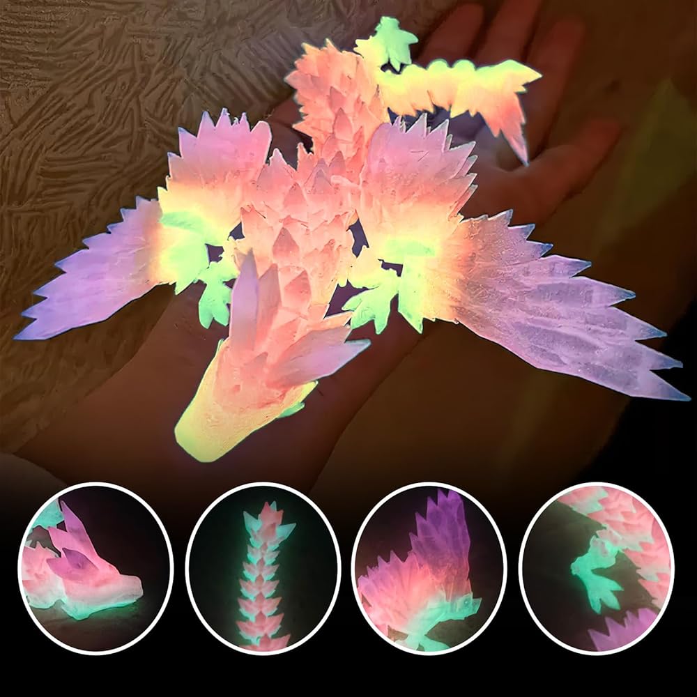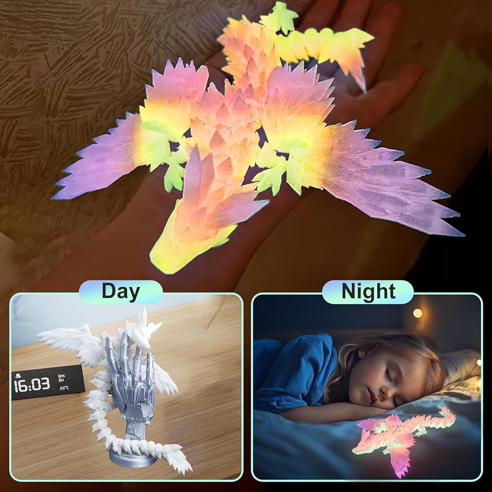 【Glow in the Dark & UV Rainbow Magic】Watch these 3D printed dragon toys come alive! They glow brightly in the dark and reveal vibrant rainbow colors under UV light/sunlight - perfect for night lights, sensory play, and 3D printed fidget toys and easter basket essentials