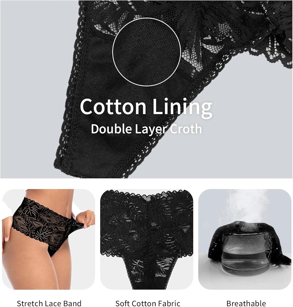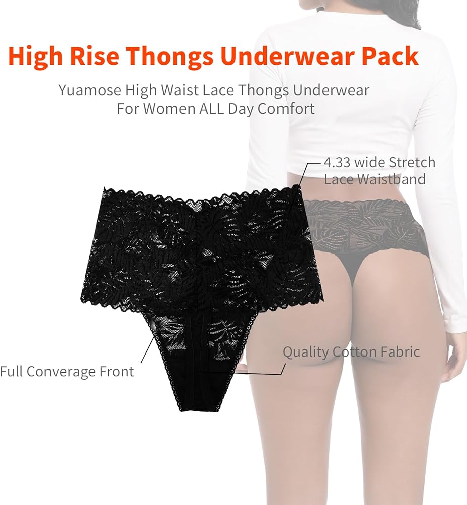 High Waisted Lace Thongs For Women: This Beautiful Lace Wide Band Thongs,The height of Lace Wasitband is about 4.5inch. Wide gusset thongs for women, Full Coverage Slimming.This wide band thongs for women wom't Bind or Pinch.Lace: 90% Nylon 10% Spandex ,Ultra-Soft Cotton Croth: 100% Cotton . Super Soft Cute Comfortable