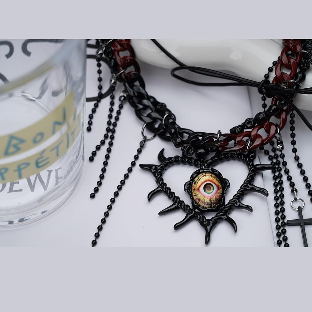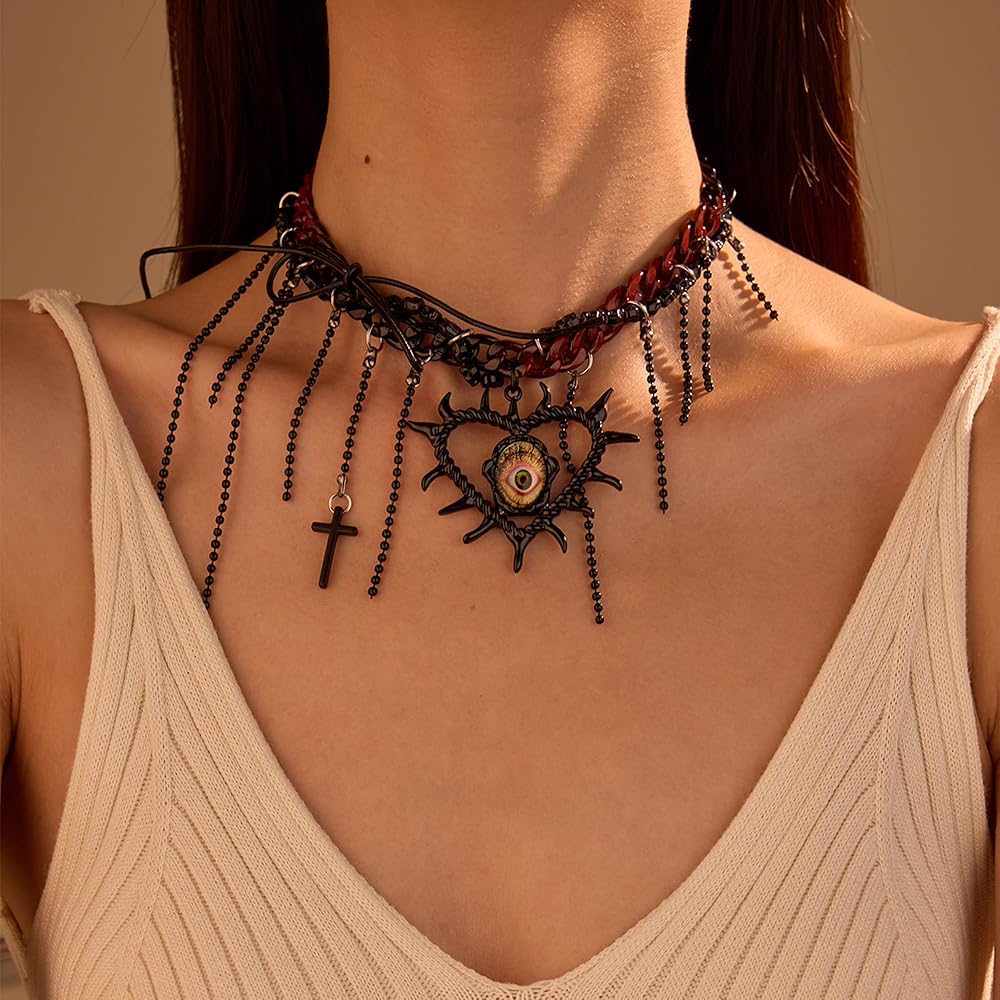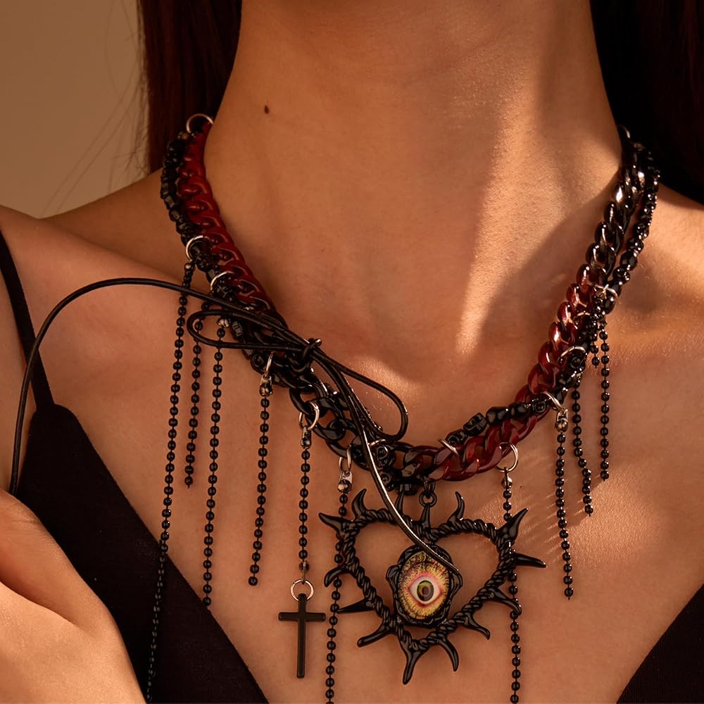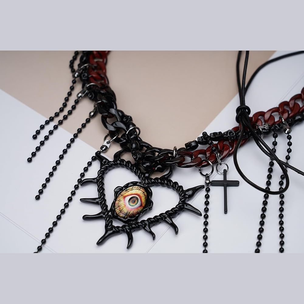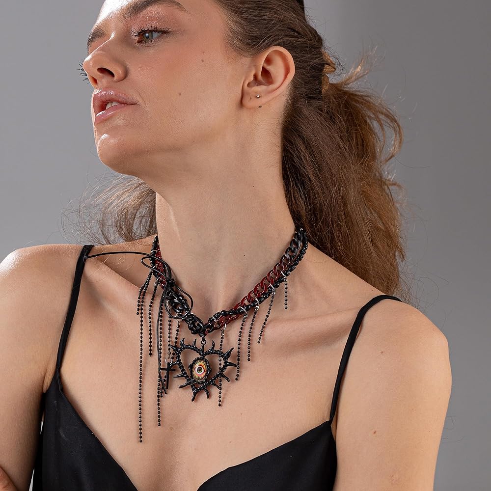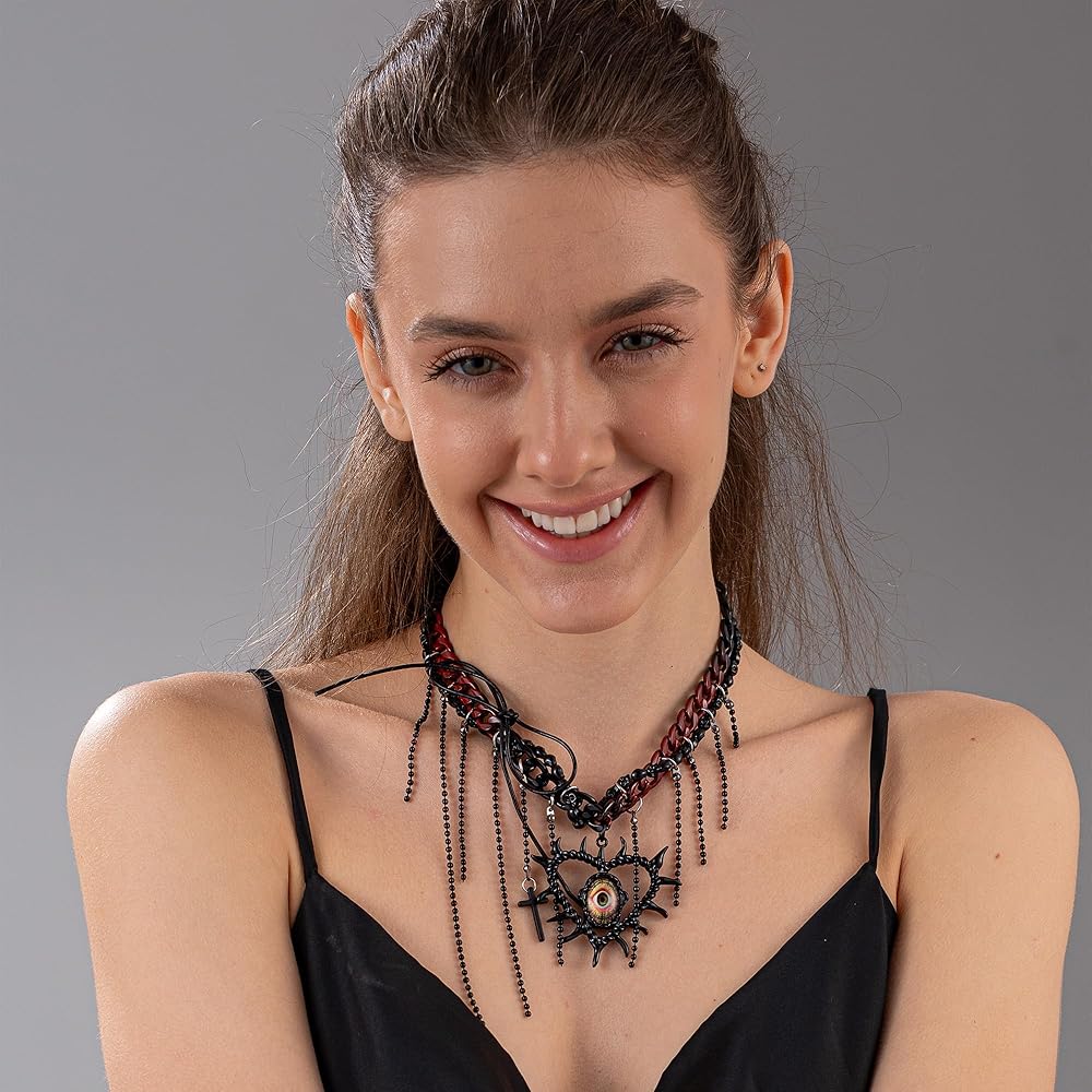 🖤 Gothic Choker Necklace with Evil Eye and Skull: This goth choker necklace features a layered design with a black and red stainless cuban chain with Evil Eye pendant and skull cross charm, embodying dark elegance. The 12.6" length (+4.7" extender) ensures a customizable fit, perfect for emo, gothic, or punk styles.