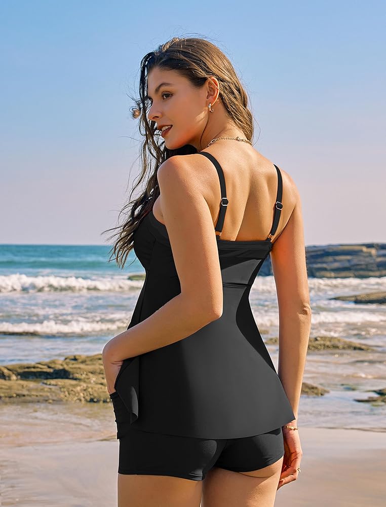 2 Piece Tankini Swimsuits: The ruffle design tops and high waist tankini shorts modify your figure and hide the imperfections