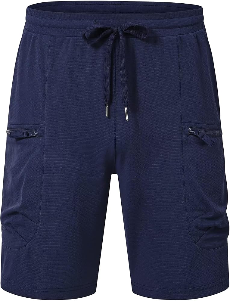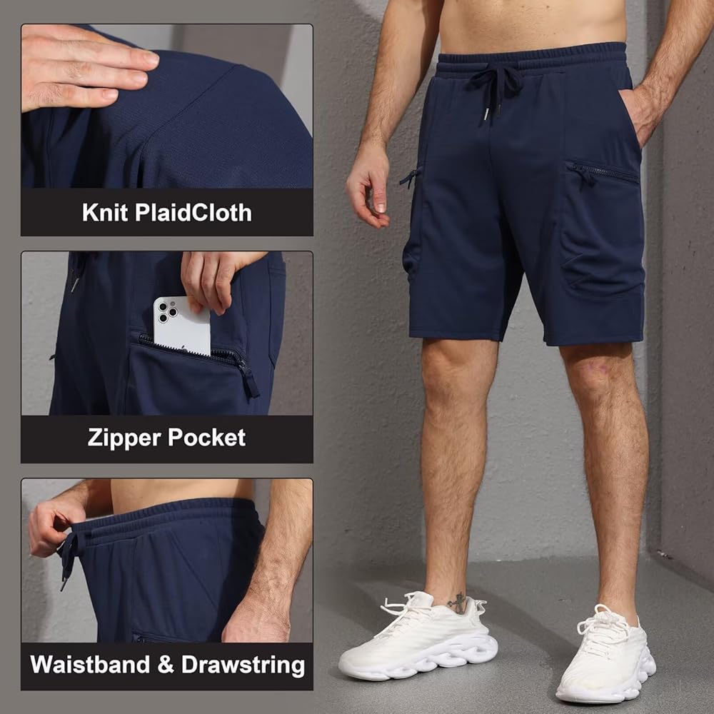 QPNGRP Men's Knit PlaidCloth 8" Inseam Elastic Waist Zipper Cargo Shorts