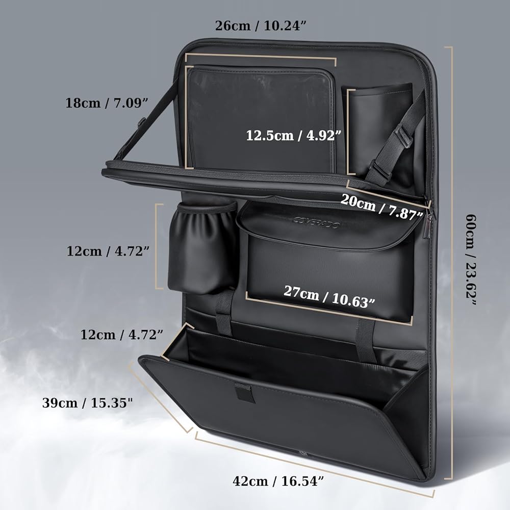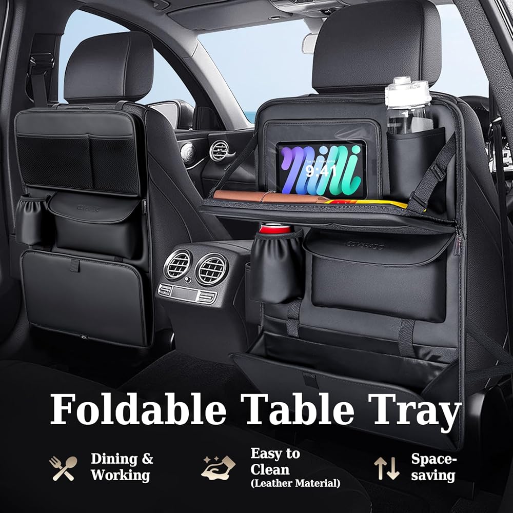 Coverado Backseat Car Organizer, Nappa Leather Car Seat Organizer with Touch Screen Tablet Holder, Foldable Food Tray, Kick Mats Protector, Multi Car Storage Accessories, Garbage Bag Holder-1 Pack
