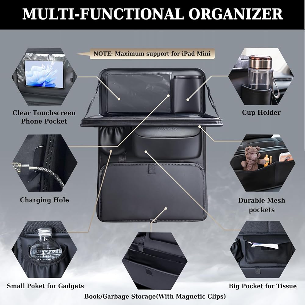 [Foldable Tray Table] This back seat car organizer features a versatile car seat tray that doubles as a dining or work surface—ideal for road trips. The built-in touchscreen-compatible tablet pocket with charging access keeps devices secure and functional. When not in use, the tray folds away to maximize car storage space.