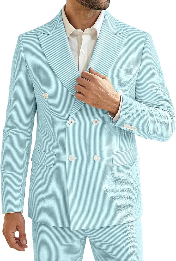 Fabric: An incredible lightweight seersucker suit in cool cotton material. Light enough to wear to a summer wedding, the derby, or nights out on a tropical vacation. material,Peak lapel blazer with flap pockets design.