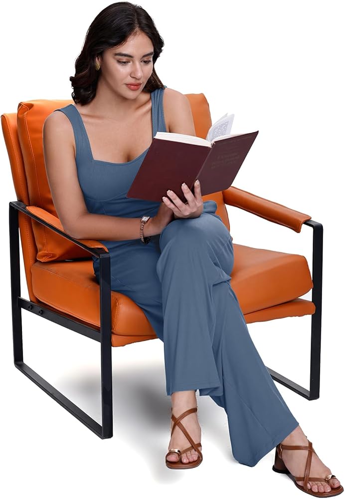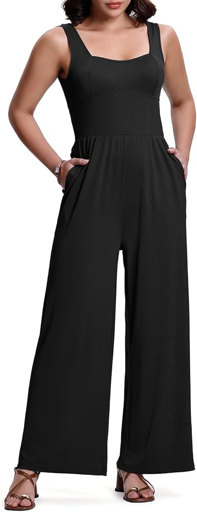 Features-Flattering square neck, sleeveless style, wide-leg pants, and two hidden pockets. Wide, non-adjustable straps ensure a secure fit, while ruching at the waist slims the silhouette. Soft, elastic ribbed knit fabric provides comfort and breathability, perfect for spring and summer.