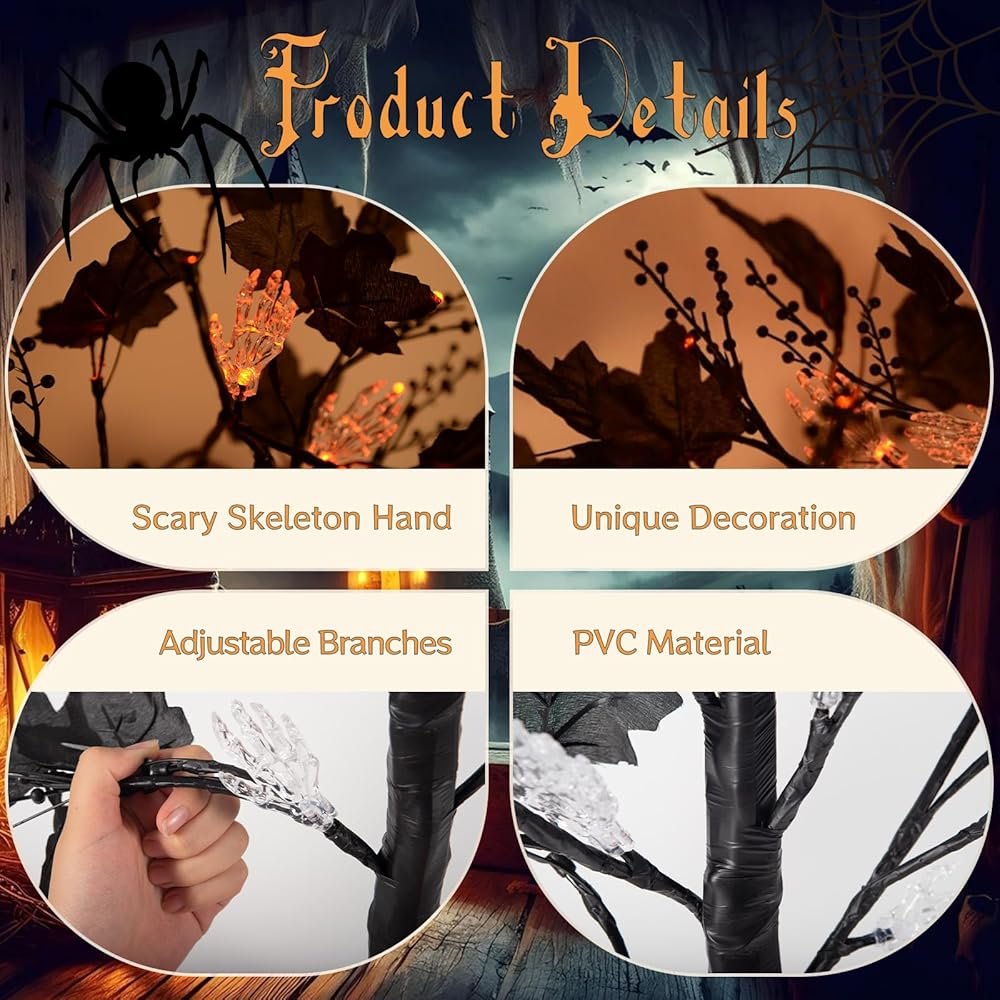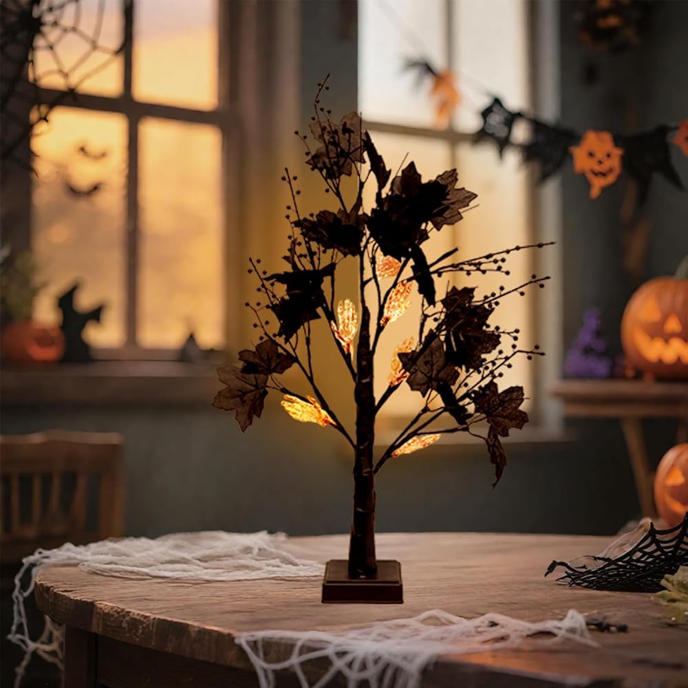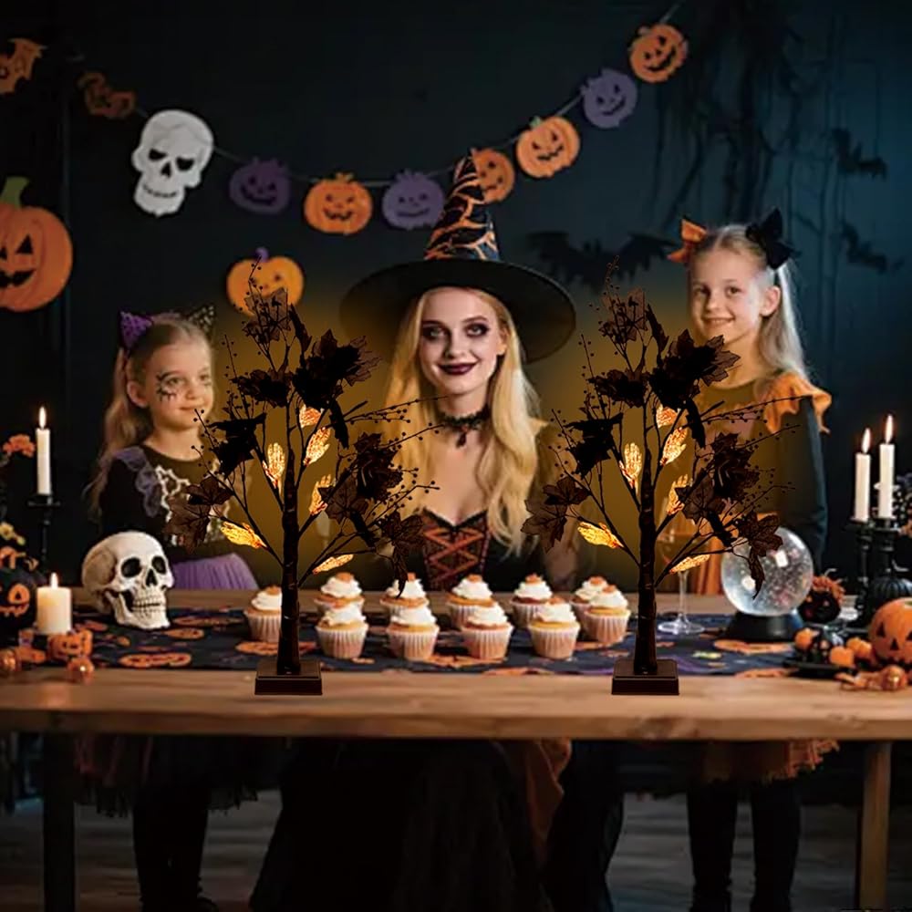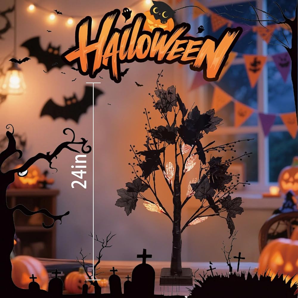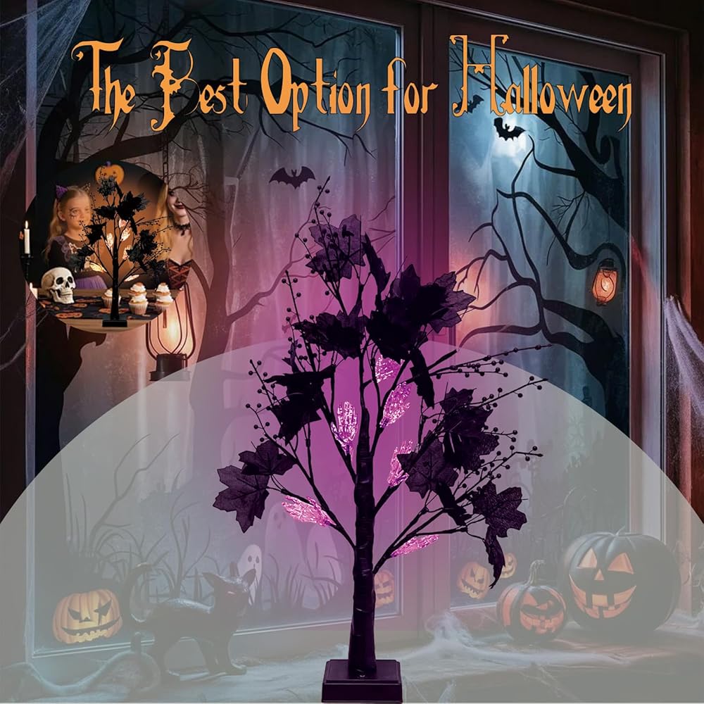 Halloween Decorations Indoor, 2ft Black Halloween Tree with 24 LED Color Change (Orange & Purple) Lights, Timer, USB/Battery Operated Halloween Table Decoration, Spooky Tree Decor