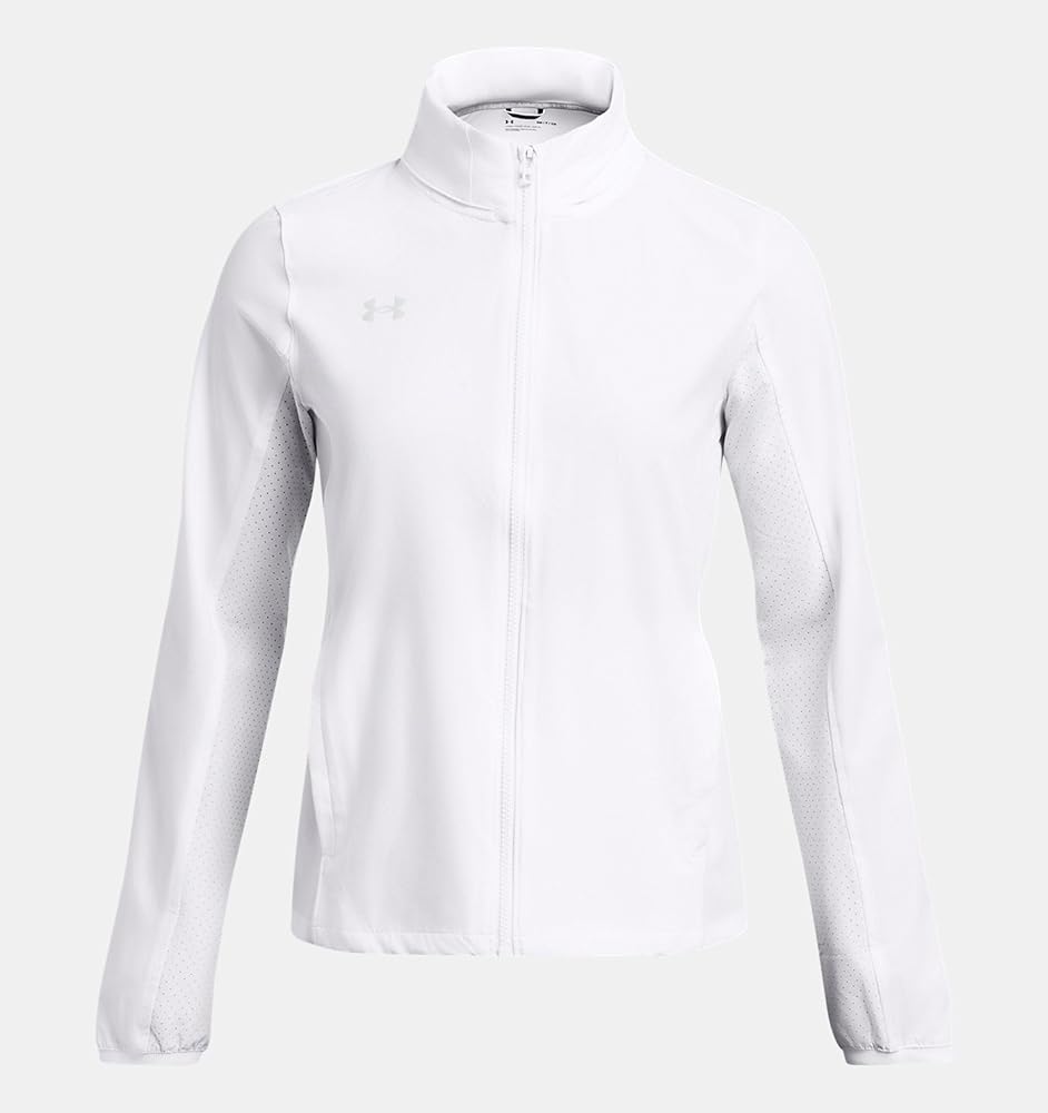 Introducing the Under Armour Women's Squad 3.0 Warm-Up Full-Zip Jacket, a perfect blend of style, comfort, and performance. This jacket is designed with the active woman in mind, providing a unique combination of breathable and water-resistant features. Whether you're warming up for a fitness session or bracing for a brisk outdoor run, this full-zip jacket equips you with the utmost comfort and durability. One of the key features of this jacket is the UA Storm technology. This advanced technology repels water without compromising breathability, making it ideal for unpredictable weather conditions. This means you can stay dry and comfortable, even when the weather isn't cooperating. The Squad 3.0 Warm-Up Jacket is made from a lightweight, stretch-woven fabric. This fabric selection not only ensures durability but also allows for unrestricted movement. The stretch-woven fabric moves with you, making it a perfect fit for all sorts of athletic activities. The jacket also features perforated overlay panels, enhancing the breathability. This means you can stay cool and comfortable, even during high-intensity workouts. The jacket is also equipped with a packable hood that can be stowed into the back collar when not in use. Open hand pockets provide a convenient storage solution for your essentials. Moreover, the jacket uses a fluorine-free water repellent treatment, maintaining the jacket's water resistance while being environmentally friendly. It features a loose, fuller cut for complete comfort, ensuring a relaxed fit that doesn't hinder your movement. Care for this jacket is straightforward. It should be washed and dried zipped up, preferably inside out. Machine wash it cold with like colors and use only non-chlorine bleach when needed. Tumble dry on low, and avoid ironing, using softeners, or dry cleaning. In terms of composition, the jacket is made of 87% Polyester and 13% Elastane, offering a comfortable and stretchy fit