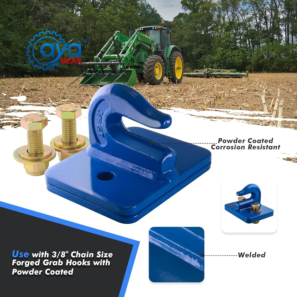 AYA GEAR Bolt-On G70 rated forged hooks arewelded to a 1/4" plate and also includes the Grade#8 nuts. These are perfect for use with G70 chains that's commonly used with small to mediumsized Compact Utility Tractor's and Sub Compact Utility Tractors. These bolt on grab hooks are galvanized to avoid rusting.